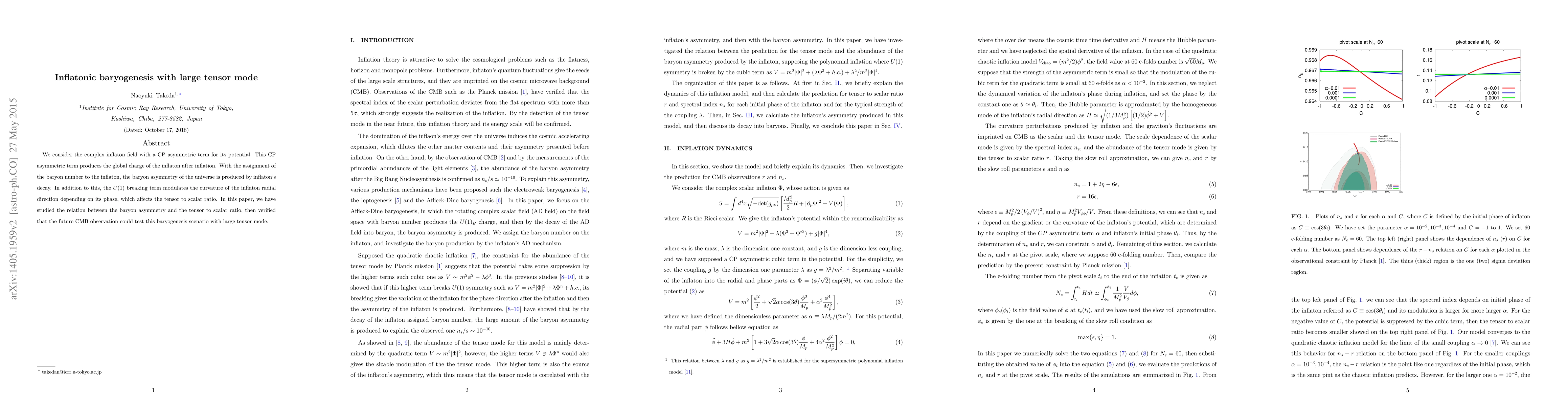 The paper presents a novel baryogenesis scenario linking inflaton's CP asymmetry to baryon asymmetry, with a detailed analysis of the tensor to scalar ratio and its dependence on inflaton potential parameters.