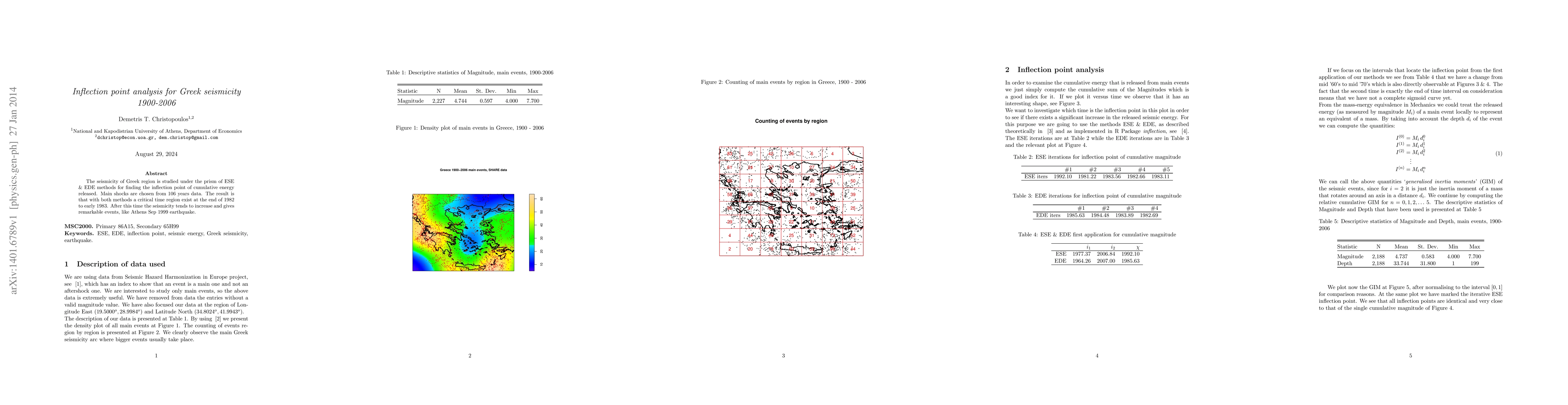 This paper analyzes Greek seismicity from 1900 to 2006 using ESE and EDE methods to identify an inflection point in cumulative energy release. It finds a critical period from late 1982 to early 1983 marking a significant increase in seismicity, culminating in notable events such as the 1999 Athens earthquake.