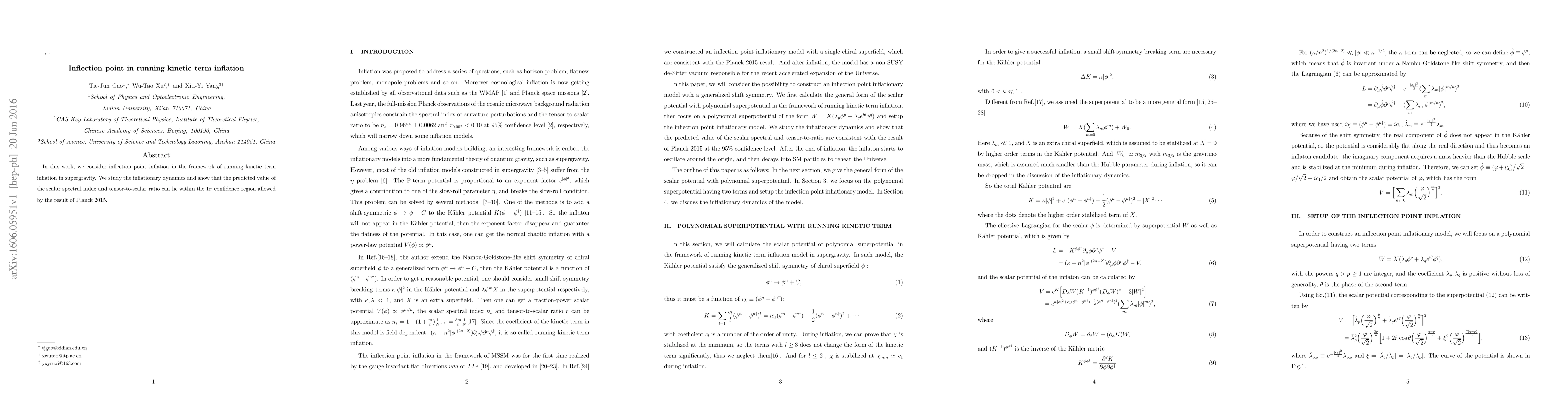 Research on inflection point inflation in running kinetic term inflation suggests its predictions for the scalar spectral index and tensor-to-scalar ratio can fit within the 1σ confidence region of Planck 2015 data.
