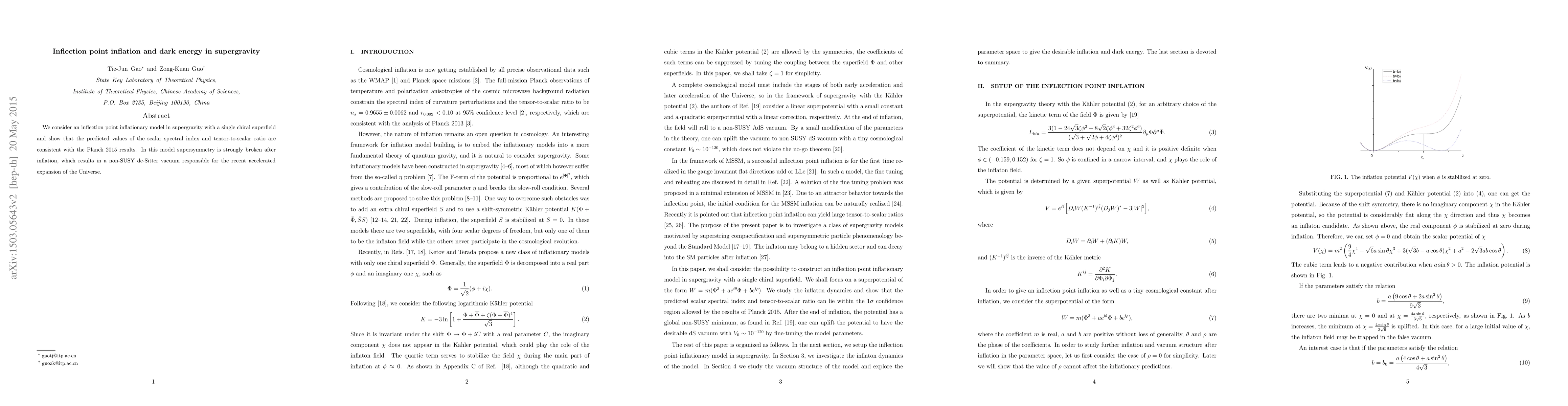 This paper explores an inflection point inflationary model in supergravity featuring a single chiral superfield, demonstrating compatibility with Planck 2015 observations. It concludes that strong supersymmetry breaking post-inflation leads to a non-SUSY de-Sitter vacuum driving the current cosmic acceleration.