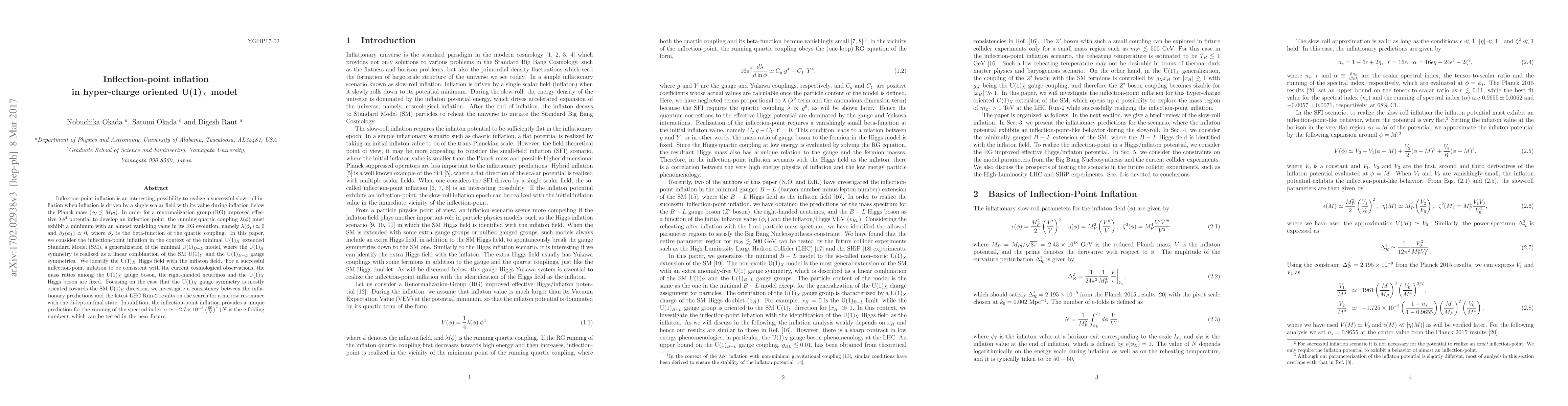 This paper explores inflection-point inflation driven by a single scalar field in a hyper-charge oriented U(1)$_X$ model, identifying the U(1)$_X$ Higgs as the inflaton. It examines the model's consistency with current cosmological observations and the latest LHC results, predicting a unique spectral index running that can be tested in future observations.