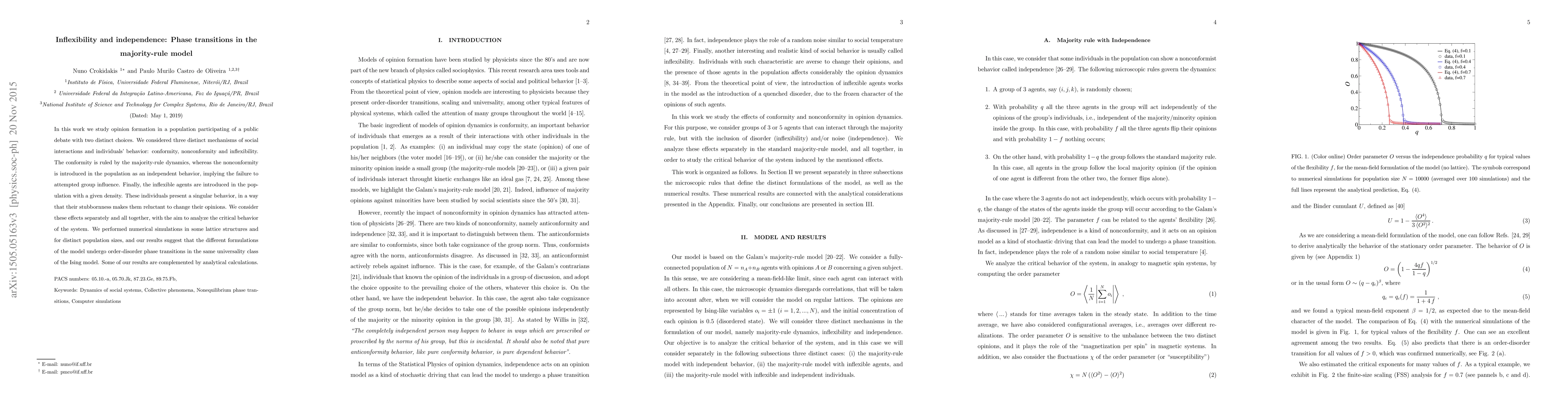 In this work we study opinion formation in a population participating of a public debate with two distinct choices. We considered three distinct mechanisms of social interactions and individuals' behavior: conformity, nonconformity and inflexibility. The conformity is ruled by the majority-rule dynamics, whereas the nonconformity is introduced in the population as an independent behavior, implying the failure to attempted group influence. Finally, the inflexible agents are introduced in the population with a given density. These individuals present a singular behavior, in a way that their stubbornness makes them reluctant to change their opinions. We consider these effects separately and all together, with the aim to analyze the critical behavior of the system. We performed numerical simulations in some lattice structures and for distinct population sizes, and our results suggest that the different formulations of the model undergo order-disorder phase transitions in the same universality class of the Ising model. Some of our results are complemented by analytical calculations.