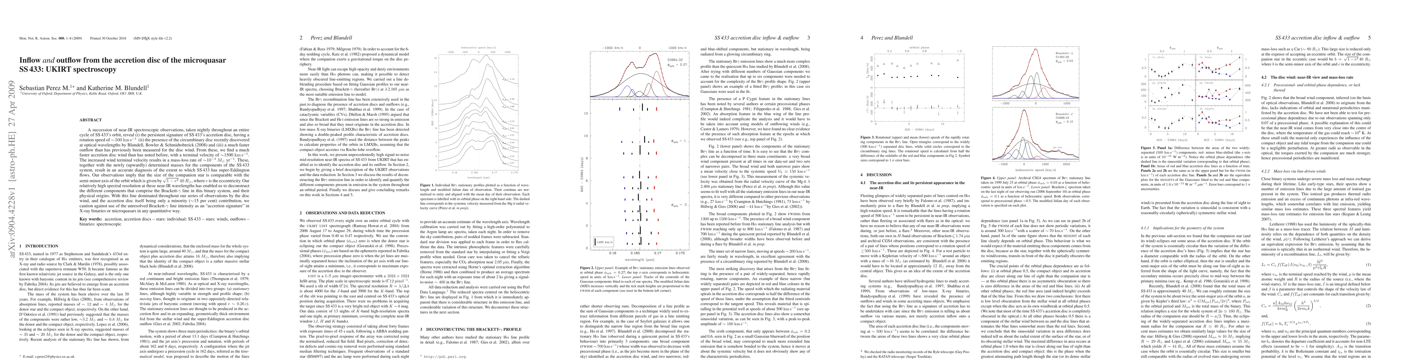 A succession of near-IR spectroscopic observations, taken nightly throughout an entire cycle of SS433's orbit, reveal (i) the persistent signature of SS433's accretion disc, having a rotation speed of ~500 km/s, (ii) the presence of the circumbinary disc recently discovered at optical wavelengths by Blundell, Bowler and Schmidtobreick (2008) and (iii) a much faster outflow than has previously been measured for the disc wind. From these, we find a much faster accretion disc wind than has noted before, with a terminal velocity of ~1500 km/s. The increased wind terminal velocity results in a mass-loss rate of ~10e-4 M_sun/yr. These, together with the newly (upwardly) determined masses for the components of the SS433 system, result in an accurate diagnosis of the extent to which SS433 has super-Eddington flows. Our observations imply that the size of the companion star is comparable with the semi-minor axis of the orbit which is given by (1-e^2)^(1/2) 40 R_sun, where e is the eccentricity. Our relatively high spectral resolution at these near-IR wavelengths has enabled us to deconstruct the different components that comprise the Brackett-gamma line in this binary system, and their physical origins. With this line dominated throughout our series of observations by the disc wind, and the accretion disc itself being only a minority (~15 per cent) contribution, we caution against use of the unresolved Brackett-gamma line intensity as an "accretion signature" in X-ray binaries or microquasars in any quantitative way.