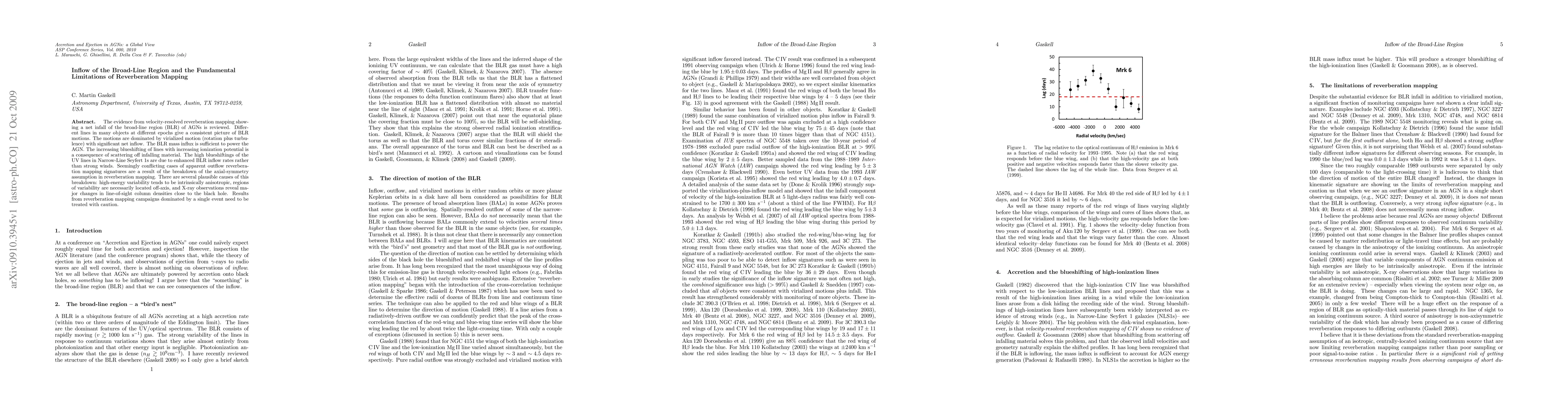 This paper reviews evidence of broad-line region (BLR) inflow in AGNs, showing that BLR motions are dominated by virialized motion with significant net inflow, sufficient to power the AGN. It also discusses the breakdown of axial-symmetry assumptions in reverberation mapping, leading to seemingly conflicting outflow signatures.