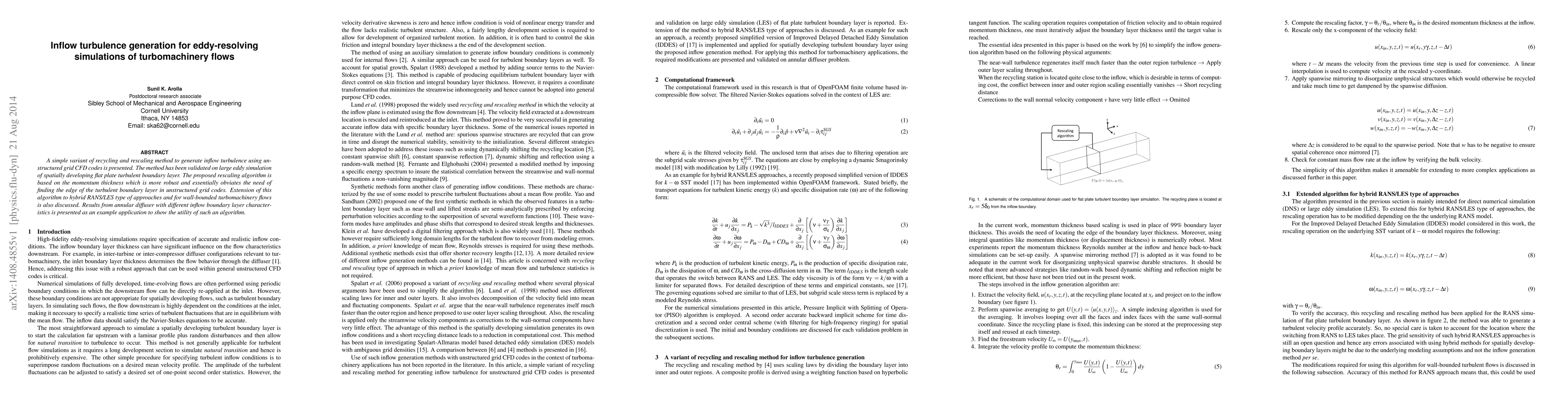 This paper presents a recycling and rescaling method for generating inflow turbulence in eddy-resolving simulations of turbomachinery flows using unstructured grid CFD codes. The method, validated through large eddy simulation of a flat plate turbulent boundary layer, uses momentum thickness for robustness and extends to hybrid RANS/LES and turbomachinery applications.
