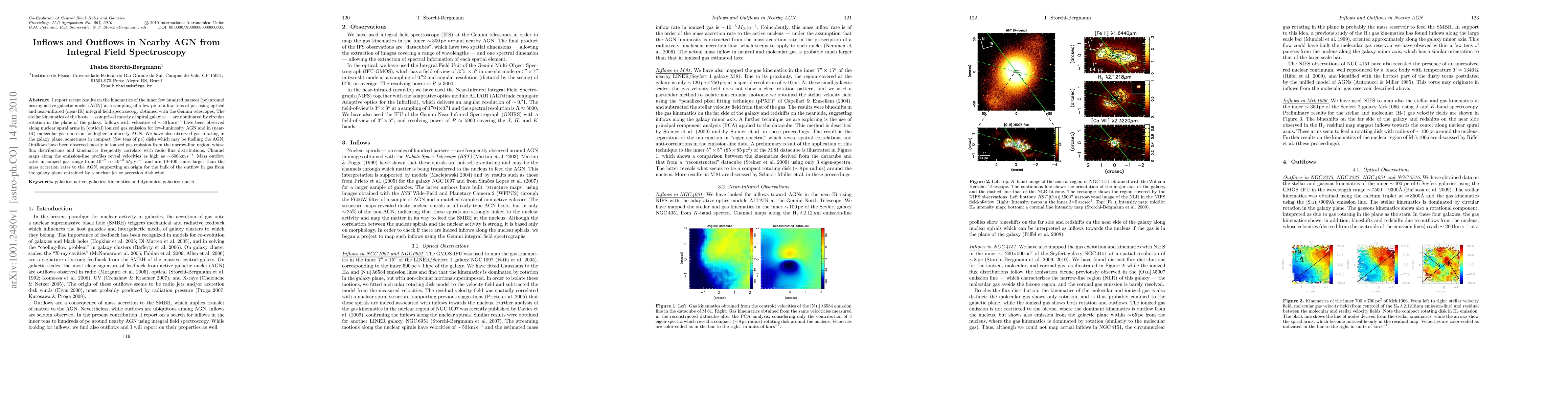 I report recent results on the kinematics of the inner few hundred parsecs (pc) around nearby active galactic nuclei (AGN) at a sampling of a few pc to a few tens of pc, using optical and near-infrared (near-IR) integral field spectroscopy obtained with the Gemini telescopes. The stellar kinematics of the hosts - comprised mostly of spiral galaxies - are dominated by circular rotation in the plane of the galaxy. Inflows with velocities of ~ 50 km/s have been observed along nuclear spiral arms in (optical) ionized gas emission for low-luminosity AGN and in (near-IR) molecular gas emission for higher-luminosity AGN. We have also observed gas rotating in the galaxy plane, sometimes in compact (few tens of pc) disks which may be fuelling the AGN. Outflows have been observed mostly in ionized gas emission from the narrow-line region, whose flux distributions and kinematics frequently correlate with radio flux distributions. Channel maps along the emission-line profiles reveal velocities as high as ~ 600 km/s. Mass outflow rates in ionized gas range from 0.01 to 0.001 solar masses per year and are 10-100 times larger than the mass accretion rates to the AGN, supporting an origin for the bulk of the outflow in gas from the galaxy plane entrained by a nuclear jet or accretion disk wind.