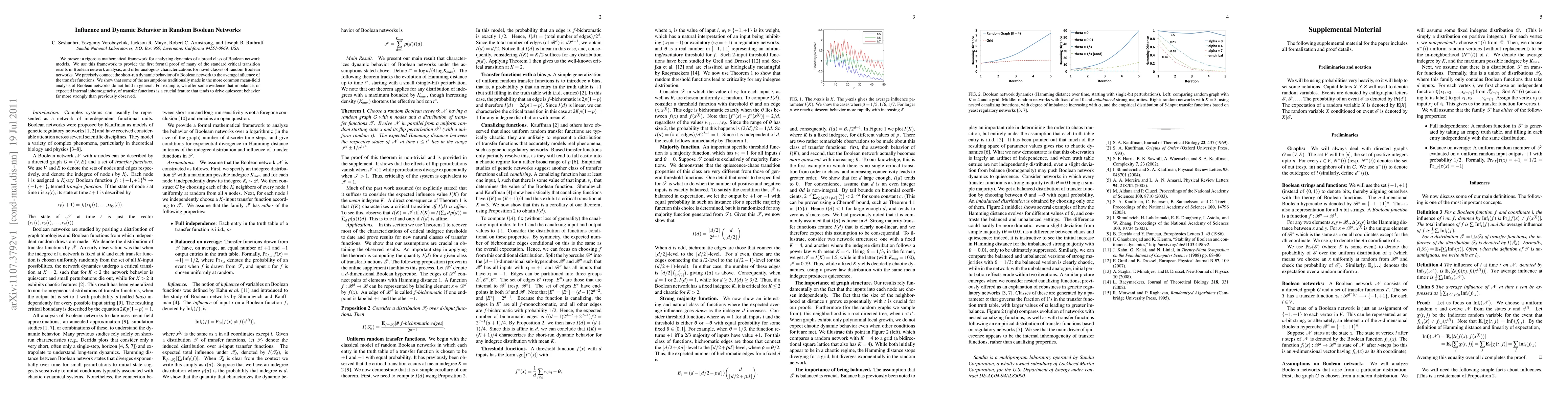 We present a rigorous mathematical framework for analyzing dynamics of a broad class of Boolean network models. We use this framework to provide the first formal proof of many of the standard critical transition results in Boolean network analysis, and offer analogous characterizations for novel classes of random Boolean networks. We precisely connect the short-run dynamic behavior of a Boolean network to the average influence of the transfer functions. We show that some of the assumptions traditionally made in the more common mean-field analysis of Boolean networks do not hold in general. For example, we offer some evidence that imbalance, or expected internal inhomogeneity, of transfer functions is a crucial feature that tends to drive quiescent behavior far more strongly than previously observed.