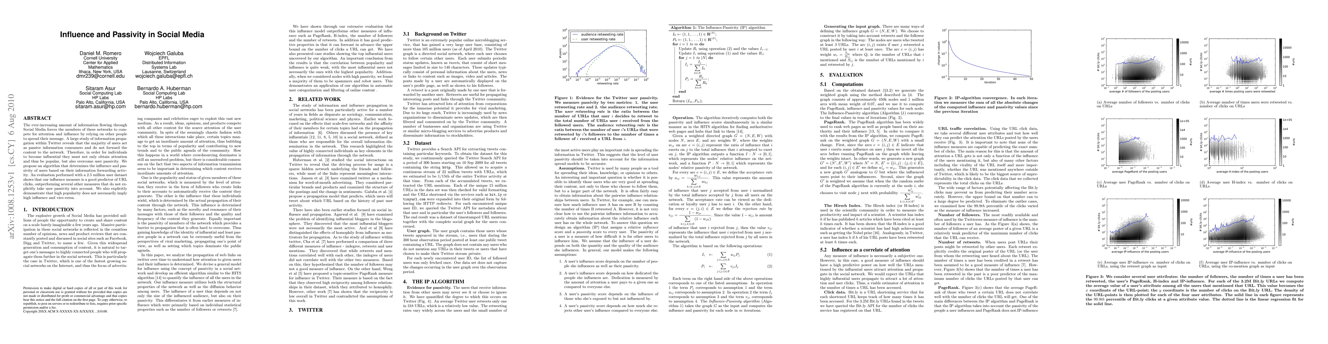 A study on social media found that most users passively consume information and don't forward it, making influence dependent on overcoming user passivity. An algorithm was developed to measure influence based on forwarding activity, which outperformed other measures in predicting URL clicks.