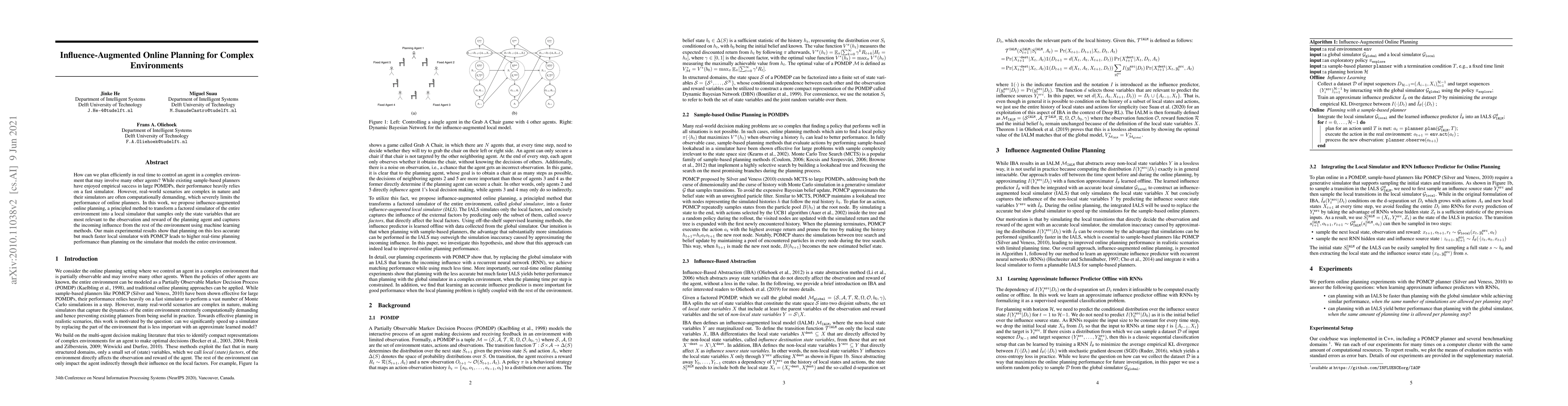 How can we plan efficiently in real time to control an agent in a complex environment that may involve many other agents? While existing sample-based planners have enjoyed empirical success in large POMDPs, their performance heavily relies on a fast simulator. However, real-world scenarios are complex in nature and their simulators are often computationally demanding, which severely limits the performance of online planners. In this work, we propose influence-augmented online planning, a principled method to transform a factored simulator of the entire environment into a local simulator that samples only the state variables that are most relevant to the observation and reward of the planning agent and captures the incoming influence from the rest of the environment using machine learning methods. Our main experimental results show that planning on this less accurate but much faster local simulator with POMCP leads to higher real-time planning performance than planning on the simulator that models the entire environment.