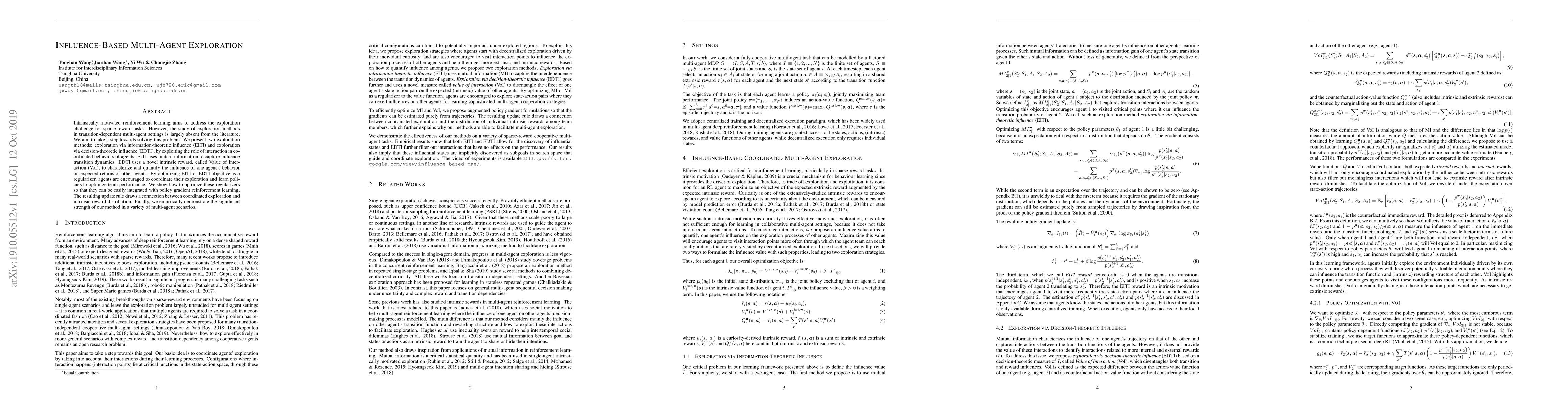 Intrinsically motivated reinforcement learning aims to address the exploration challenge for sparse-reward tasks. However, the study of exploration methods in transition-dependent multi-agent settings is largely absent from the literature. We aim to take a step towards solving this problem. We present two exploration methods: exploration via information-theoretic influence (EITI) and exploration via decision-theoretic influence (EDTI), by exploiting the role of interaction in coordinated behaviors of agents. EITI uses mutual information to capture influence transition dynamics. EDTI uses a novel intrinsic reward, called Value of Interaction (VoI), to characterize and quantify the influence of one agent's behavior on expected returns of other agents. By optimizing EITI or EDTI objective as a regularizer, agents are encouraged to coordinate their exploration and learn policies to optimize team performance. We show how to optimize these regularizers so that they can be easily integrated with policy gradient reinforcement learning. The resulting update rule draws a connection between coordinated exploration and intrinsic reward distribution. Finally, we empirically demonstrate the significant strength of our method in a variety of multi-agent scenarios.