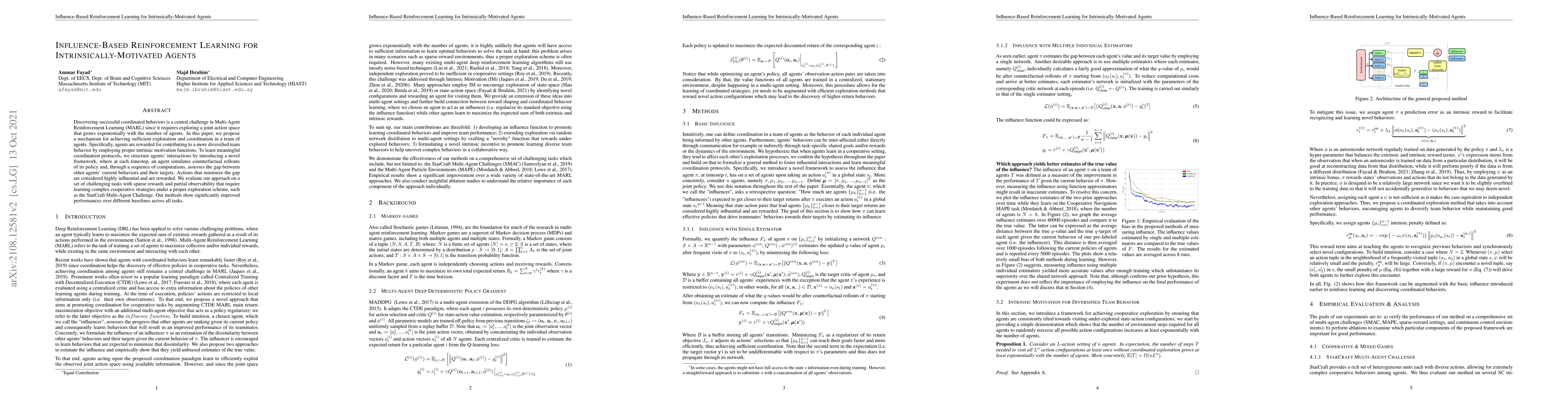 Discovering successful coordinated behaviors is a central challenge in Multi-Agent Reinforcement Learning (MARL) since it requires exploring a joint action space that grows exponentially with the number of agents. In this paper, we propose a mechanism for achieving sufficient exploration and coordination in a team of agents. Specifically, agents are rewarded for contributing to a more diversified team behavior by employing proper intrinsic motivation functions. To learn meaningful coordination protocols, we structure agents' interactions by introducing a novel framework, where at each timestep, an agent simulates counterfactual rollouts of its policy and, through a sequence of computations, assesses the gap between other agents' current behaviors and their targets. Actions that minimize the gap are considered highly influential and are rewarded. We evaluate our approach on a set of challenging tasks with sparse rewards and partial observability that require learning complex cooperative strategies under a proper exploration scheme, such as the StarCraft Multi-Agent Challenge. Our methods show significantly improved performances over different baselines across all tasks.