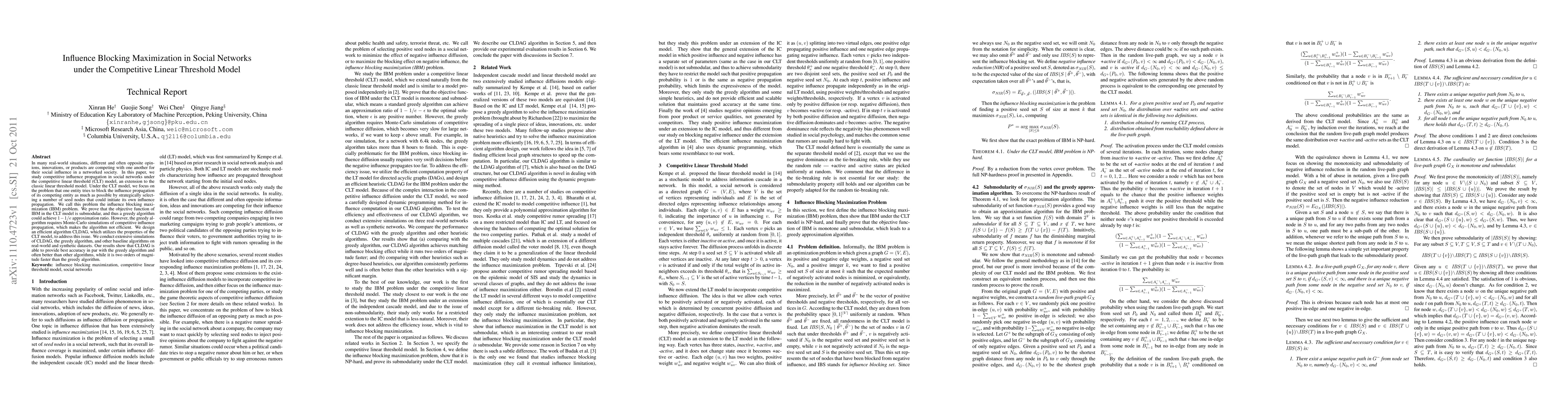 The paper studies competitive influence propagation in social networks under the competitive linear threshold (CLT) model, an extension of the classic linear threshold model. It focuses on the influence blocking maximization (IBM) problem, where one entity tries to block another's influence propagation by strategically selecting seed nodes.