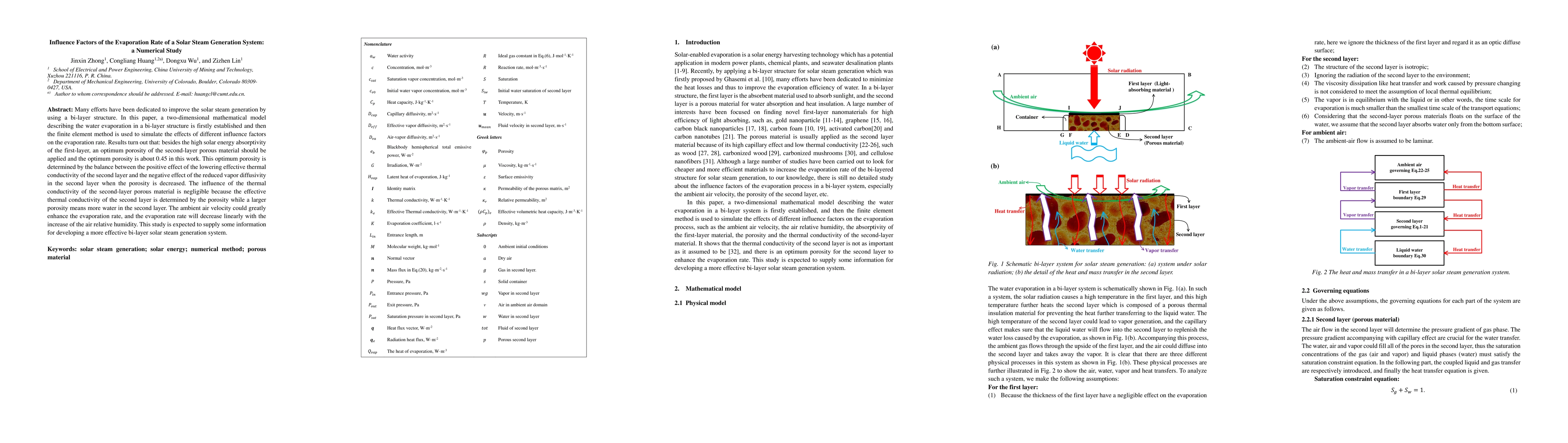 This paper establishes a mathematical model to simulate solar steam generation in a bi-layer structure, finding that optimal porosity (around 0.45) in the second layer balances thermal conductivity and vapor diffusivity, while ambient air velocity significantly enhances evaporation. The study aims to inform the development of more efficient solar steam systems.