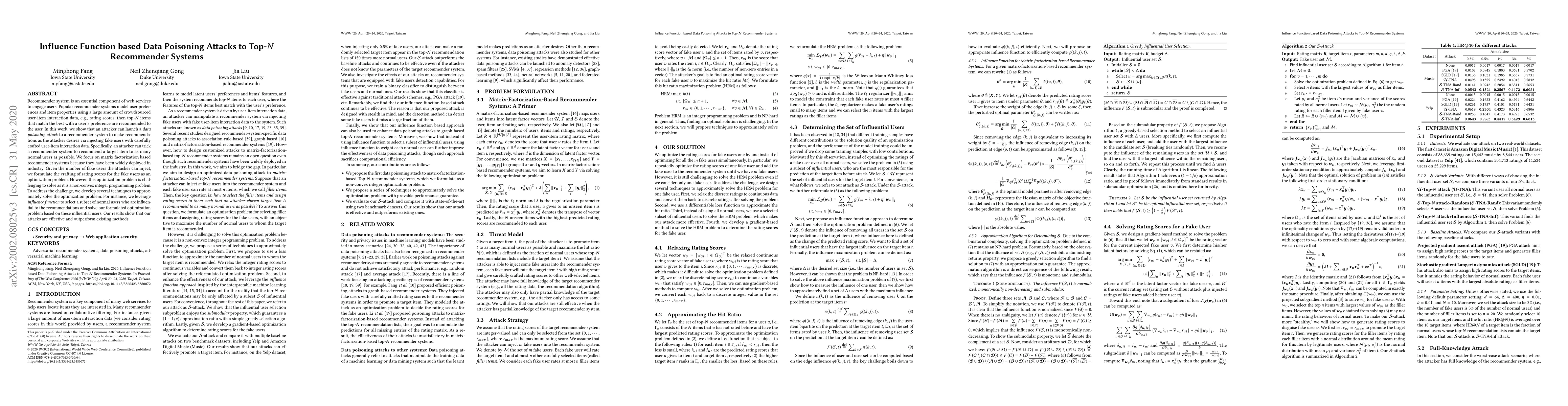 This paper investigates data poisoning attacks on matrix factorization-based recommender systems, demonstrating how attackers can manipulate recommendations by injecting fake user data. The authors develop techniques leveraging the influence function to optimize the attack, showing effective results in altering top-N recommendations to favor target items.