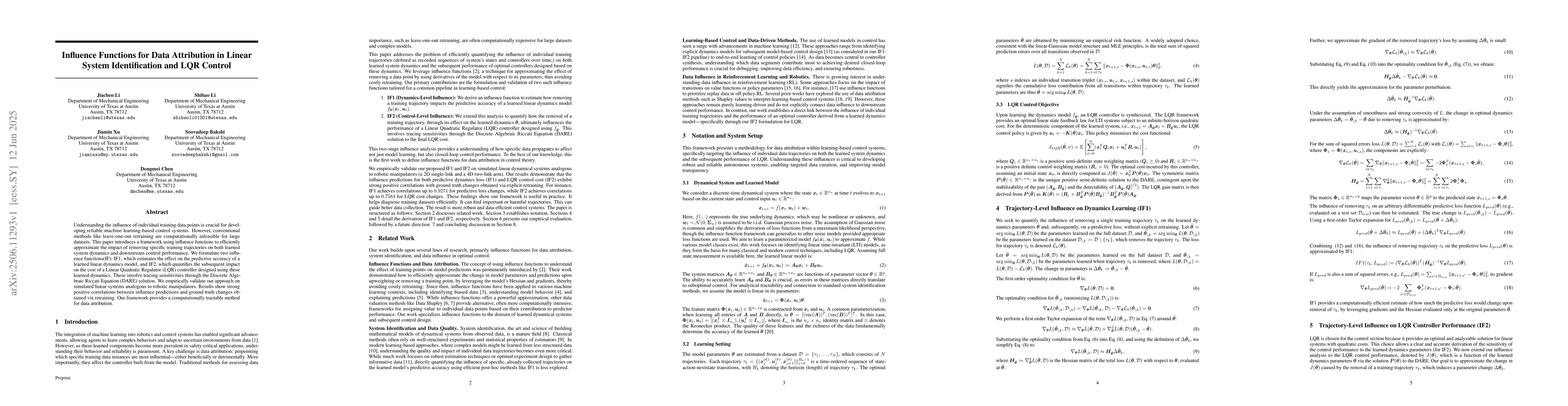Understanding the influence of individual training data points is crucial for developing reliable machine learning-based control systems. However, conventional methods like leave-one-out retraining are computationally infeasible for large datasets. This paper introduces a framework using influence functions to efficiently approximate the impact of removing specific training trajectories on both learned system dynamics and downstream control performance. We formulate two influence functions(IF): IF1, which estimates the effect on the predictive accuracy of a learned linear dynamics model, and IF2, which quantifies the subsequent impact on the cost of a Linear Quadratic Regulator (LQR) controller designed using these learned dynamics. These involve tracing sensitivities through the Discrete Algebraic Riccati Equation (DARE) solution. We empirically validate our approach on simulated linear systems analogous to robotic manipulators. Results show strong positive correlations between influence predictions and ground truth changes obtained via retraining. Our framework provides a computationally tractable method for data attribution.