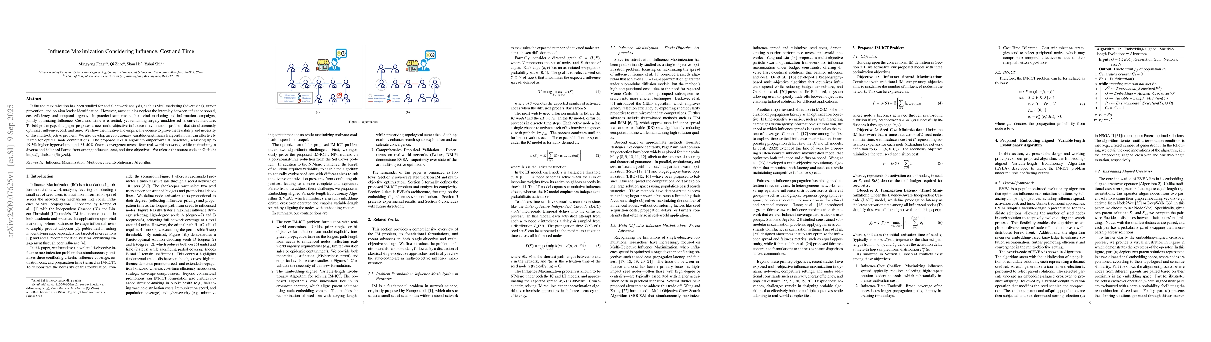 Influence maximization has been studied for social network analysis, such as viral marketing (advertising), rumor prevention, and opinion leader identification. However, most studies neglect the interplay between influence spread, cost efficiency, and temporal urgency. In practical scenarios such as viral marketing and information campaigns, jointly optimizing Influence, Cost, and Time is essential, yet remaining largely unaddressed in current literature. To bridge the gap, this paper proposes a new multi-objective influence maximization problem that simultaneously optimizes influence, cost, and time. We show the intuitive and empirical evidence to prove the feasibility and necessity of this multi-objective problem. We also develop an evolutionary variable-length search algorithm that can effectively search for optimal node combinations. The proposed EVEA algorithm outperforms all baselines, achieving up to 19.3% higher hypervolume and 25 to 40% faster convergence across four real-world networks, while maintaining a diverse and balanced Pareto front among influence, cost, and time objectives.