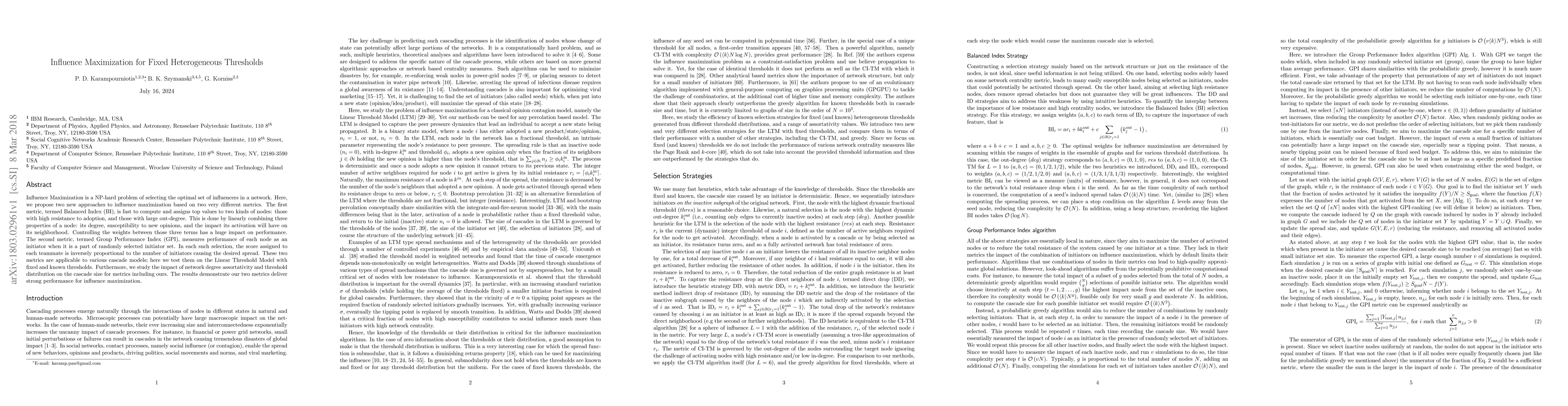 Influence Maximization is a NP-hard problem of selecting the optimal set of influencers in a network. Here, we propose two new approaches to influence maximization based on two very different metrics. The first metric, termed Balanced Index (BI), is fast to compute and assigns top values to two kinds of nodes: those with high resistance to adoption, and those with large out-degree. This is done by linearly combining three properties of a node: its degree, susceptibility to new opinions, and the impact its activation will have on its neighborhood. Controlling the weights between those three terms has a huge impact on performance. The second metric, termed Group Performance Index (GPI), measures performance of each node as an initiator when it is a part of randomly selected initiator set. In each such selection, the score assigned to each teammate is inversely proportional to the number of initiators causing the desired spread. These two metrics are applicable to various cascade models; here we test them on the Linear Threshold Model with fixed and known thresholds. Furthermore, we study the impact of network degree assortativity and threshold distribution on the cascade size for metrics including ours. The results demonstrate our two metrics deliver strong performance for influence maximization.