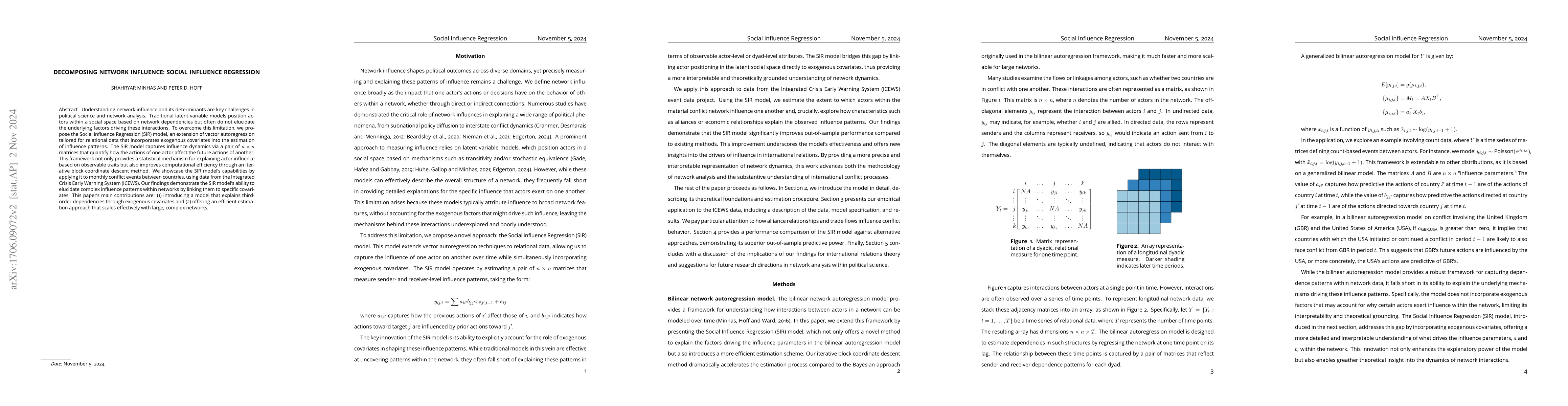 Measuring influence and determining what drives it are persistent questions in political science and in network analysis more generally. Herein we focus on the domain of international relations. Our major substantive question is: How can we determine what characteristics make an actor influential? To address the topic of influence, we build on a multilinear tensor regression framework (MLTR) that captures influence relationships using a tensor generalization of a vector autoregression model. Influence relationships in that approach are captured in a pair of n x n matrices and provide measurements of how the network actions of one actor may influence the future actions of another. A limitation of the MLTR and earlier latent space approaches is that there are no direct mechanisms through which to explain why a certain actor is more or less influential than others. Our new framework, social influence regression, provides a way to statistically model the influence of one actor on another as a function of characteristics of the actors. Thus we can move beyond just estimating that an actor influences another to understanding why. To highlight the utility of this approach, we apply it to studying monthly-level conflictual events between countries as measured through the Integrated Crisis Early Warning System (ICEWS) event data project.