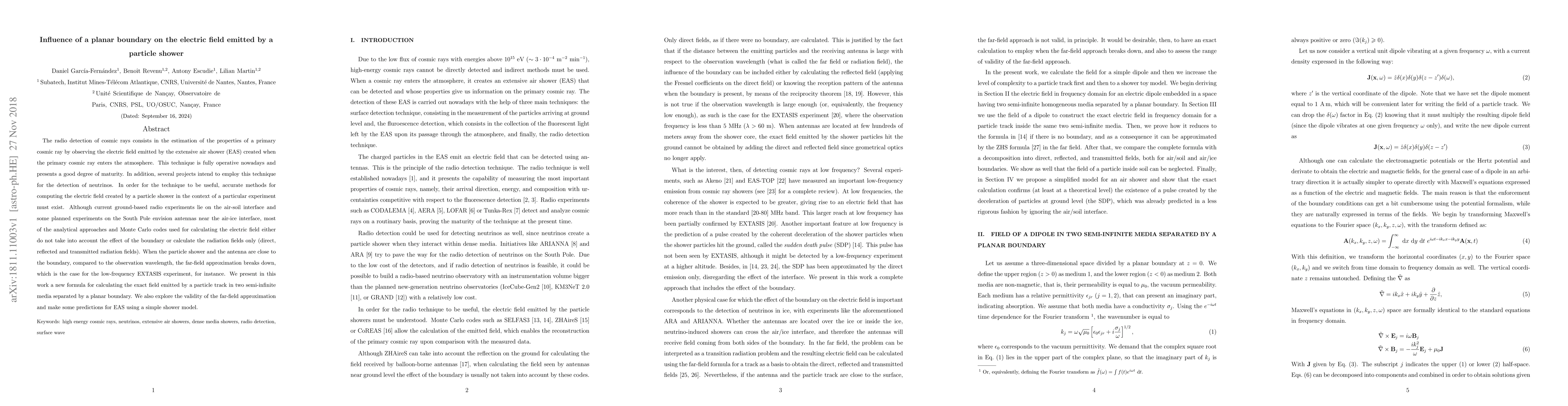 The radio detection of cosmic rays consists in the estimation of the properties of a primary cosmic ray by observing the electric field emitted by the extensive air shower (EAS) created when the primary cosmic ray enters the atmosphere. This technique is fully operative nowadays and presents a good degree of maturity. In addition, several projects intend to employ this technique for the detection of neutrinos. In order for the technique to be useful, accurate methods for computing the electric field created by a particle shower in the context of a particular experiment must exist. Although current ground-based radio experiments lie on the air-soil interface and some planned experiments on the South Pole envision antennas near the air-ice interface, most of the analytical approaches and Monte Carlo codes used for calculating the electric field either do not take into account the effect of the boundary or calculate the radiation fields only (direct, reflected and transmitted radiation fields). When the particle shower and the antenna are close to the boundary, compared to the observation wavelength, the far-field approximation breaks down, which is the case for the low-frequency EXTASIS experiment, for instance. We present in this work a new formula for calculating the exact field emitted by a particle track in two semi-infinite media separated by a planar boundary. We also explore the validity of the far-field approximation and make some predictions for EAS using a simple shower model.