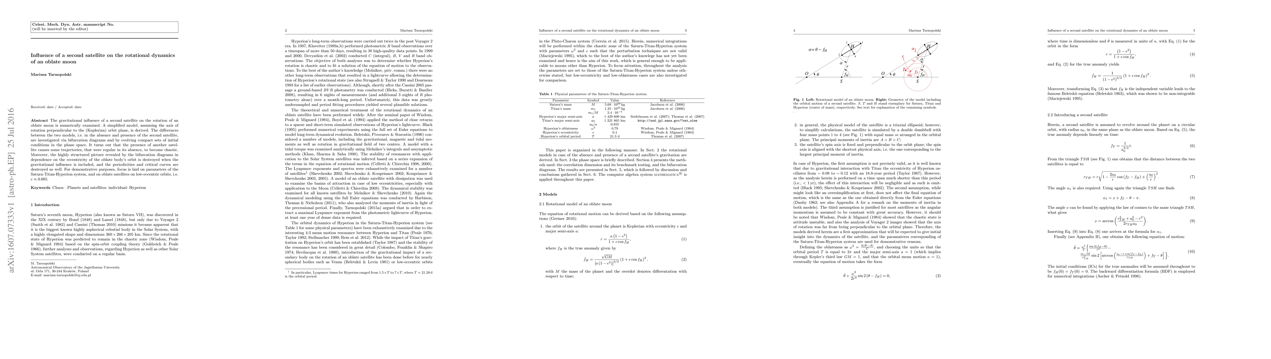 The gravitational influence of a second satellite on the rotation of an oblate moon is numerically examined. A simplified model, assuming the axis of rotation perpendicular to the (Keplerian) orbit plane, is derived. The differences between the two models, i.e. in the absence and presence of the second satellite, are investigated via bifurcation diagrams and by evolving compact sets of initial conditions in the phase space. It turns out that the presence of another satellite causes some trajectories, that were regular in its absence, to become chaotic. Moreover, the highly structured picture revealed by the bifurcation diagrams in dependence on the eccentricity of the oblate body's orbit is destroyed when the gravitational influence is included, and the periodicities and critical curves are destroyed as well. For demonstrative purposes, focus is laid on parameters of the Saturn-Titan-Hyperion system, and on oblate satellites on low-eccentric orbits, i.e. $e\approx 0.005$.