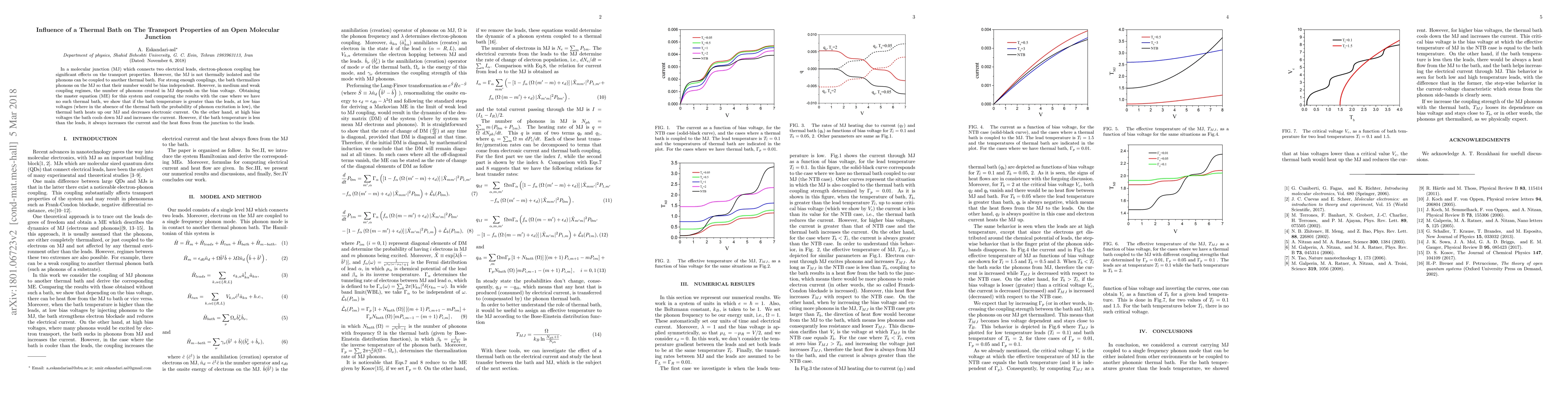 This study investigates how a thermal bath affects the transport properties in an open molecular junction, showing that the thermal bath temperature relative to the leads determines whether it decreases or increases electronic current at different bias voltages. At low biases, the bath heats the junction and reduces current, while at high biases, it cools the junction and enhances current when its temperature is higher than the leads.