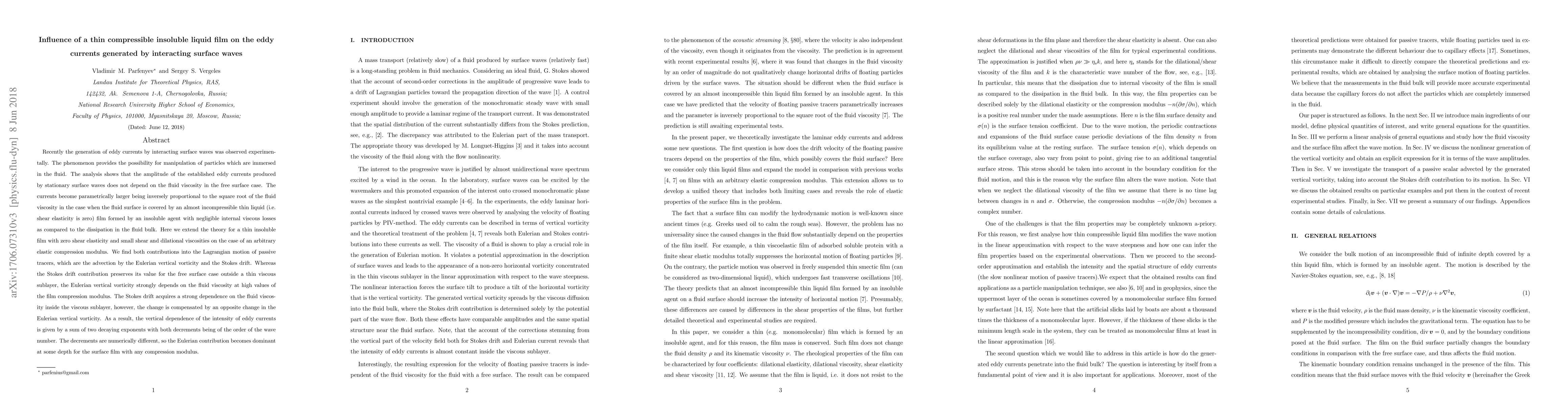 Recently the generation of eddy currents by interacting surface waves was observed experimentally. The phenomenon provides the possibility for manipulation of particles which are immersed in the fluid. The analysis shows that the amplitude of the established eddy currents produced by stationary surface waves does not depend on the fluid viscosity in the free surface case. The currents become parametrically larger being inversely proportional to the square root of the fluid viscosity in the case when the fluid surface is covered by an almost incompressible thin liquid (i.e. shear elasticity is zero) film formed by an insoluble agent with negligible internal viscous losses as compared to the dissipation in the fluid bulk. Here we extend the theory for a thin insoluble film with zero shear elasticity and small shear and dilational viscosities on the case of an arbitrary elastic compression modulus. We find both contributions into the Lagrangian motion of passive tracers, which are the advection by the Eulerian vertical vorticity and the Stokes drift. Whereas the Stokes drift contribution preserves its value for the free surface case outside a thin viscous sublayer, the Eulerian vertical vorticity strongly depends on the fluid viscosity at high values of the film compression modulus. The Stokes drift acquires a strong dependence on the fluid viscosity inside the viscous sublayer, however, the change is compensated by an opposite change in the Eulerian vertical vorticity. As a result, the vertical dependence of the intensity of eddy currents is given by a sum of two decaying exponents with both decrements being of the order of the wave number. The decrements are numerically different, so the Eulerian contribution becomes dominant at some depth for the surface film with any compression modulus.