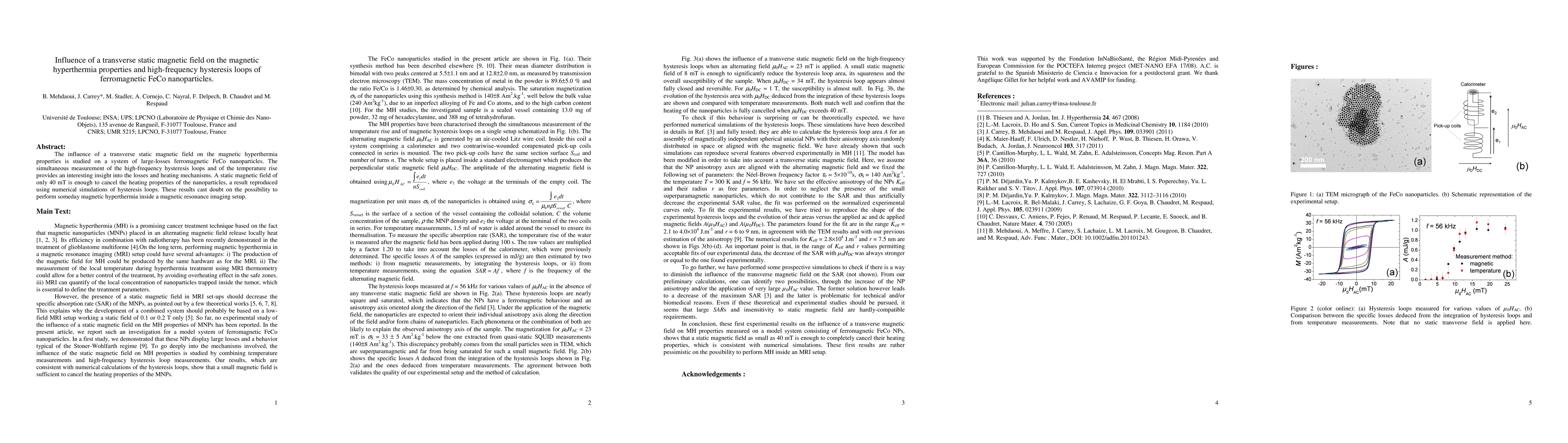 This study investigates the impact of a transverse static magnetic field on the magnetic hyperthermia properties and high-frequency hysteresis loops of ferromagnetic FeCo nanoparticles. A static field of 40 mT can negate the heating effects, suggesting challenges for magnetic hyperthermia in MRI environments.