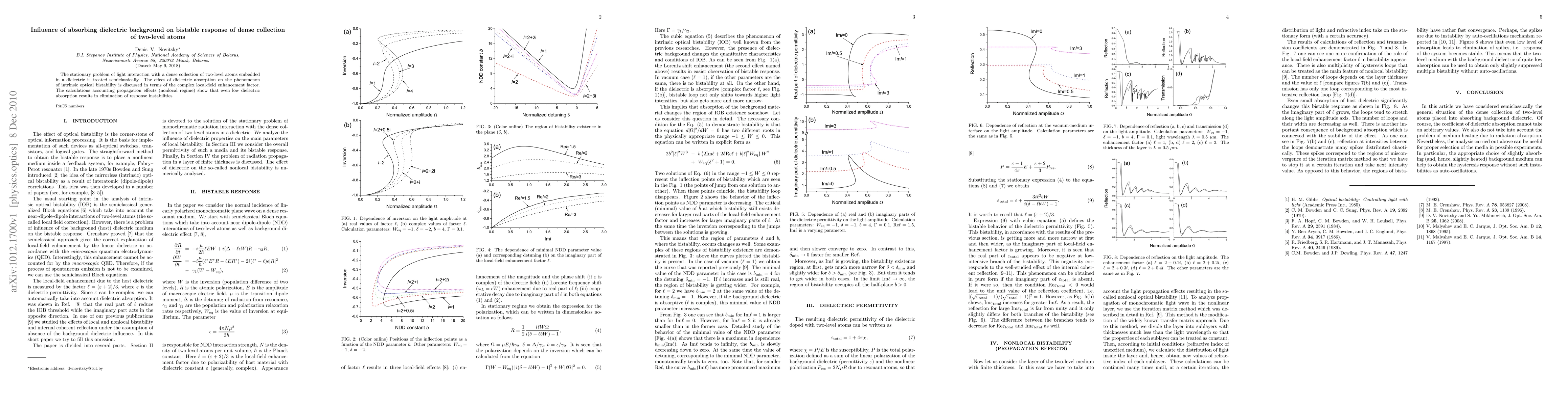 This paper investigates the impact of absorbing dielectric backgrounds on the optical bistability of dense two-level atoms using semiclassical theory. The study finds that even minimal dielectric absorption can eliminate instabilities in the optical response due to the complex local-field enhancement factor.