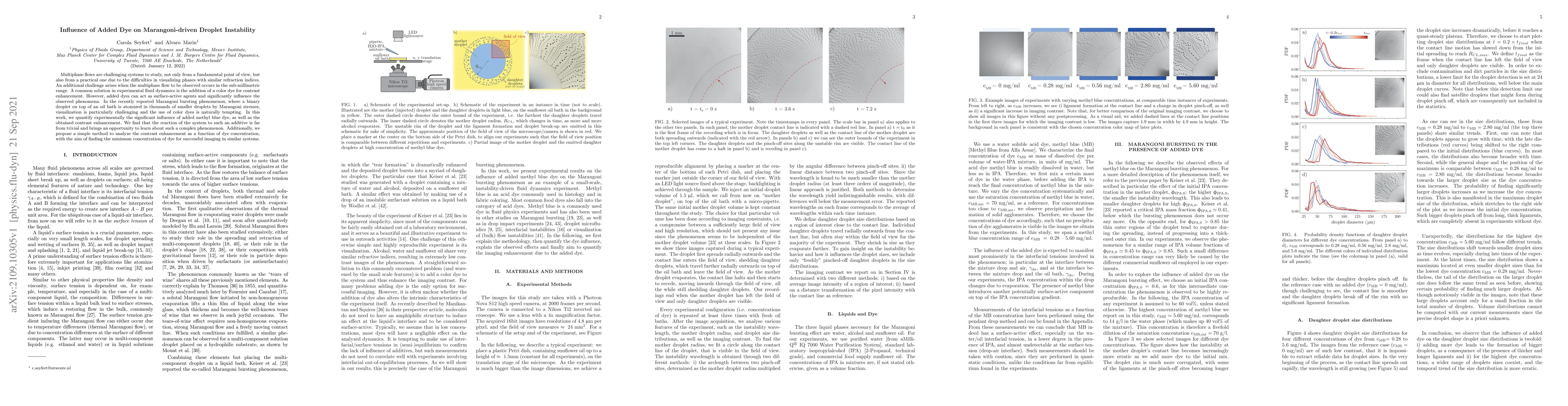 Multiphase flows are challenging systems to study, not only from a fundamental point of view, but also from a practical one due to the difficulties in visualizing phases with similar refraction indices. An additional challenge arises when the multiphase flow to be observed occurs in the sub-millimetric range. A common solution in experimental fluid dynamics is the addition of a color dye for contrast enhancement. However, added dyes can act as surface-active agents and significantly influence the observed phenomena. In the recently reported Marangoni bursting phenomenon, where a binary droplet on top of an oil bath is atomized in thousands of smaller droplets by Marangoni stresses, visualization is particularly challenging and the use of color dyes is naturally tempting. In this work, we quantify experimentally the significant influence of added methyl blue dye, as well as the obtained contrast enhancement. We find that the reaction of the system to such an additive is far from trivial and brings an opportunity to learn about such a complex phenomenon. Additionally, we propose a simple method to analyze the contrast enhancement as a function of dye concentration, with the aim of finding the minimum concentration of dye for successful imaging in similar systems.