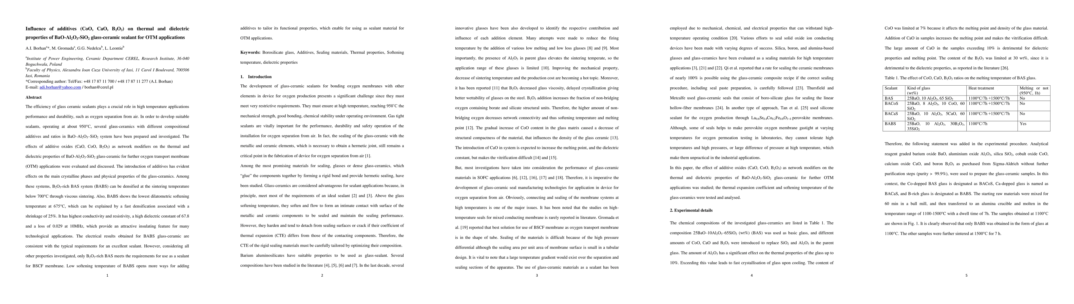 Researchers investigated the effect of additives (CoO, CaO, B2O3) on thermal and dielectric properties of BaO-Al2O3-SiO2 glass-ceramic sealants for high-temperature applications. A B2O3-rich system showed promising results with a low softening temperature and high conductivity.