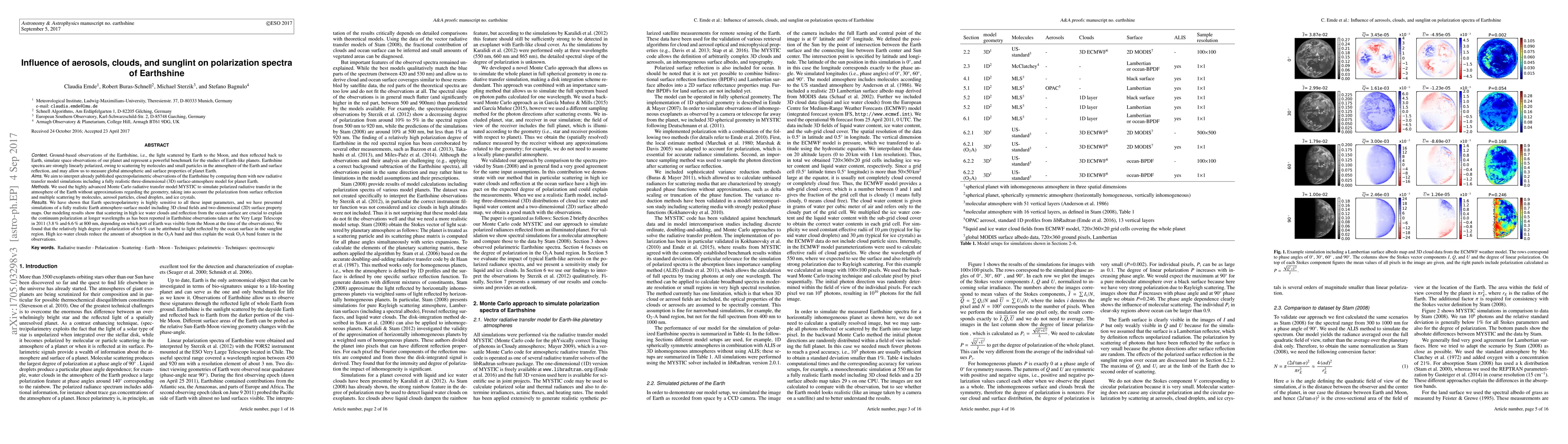 This paper investigates the influence of aerosols, clouds, and sunglint on the polarization spectra of Earthshine using advanced radiative transfer models. The study finds that scattering by high ice water clouds and ocean surface reflection, particularly in the sunglint region, significantly contribute to the observed polarization, explaining the high degree of polarization seen in Earthshine observations.