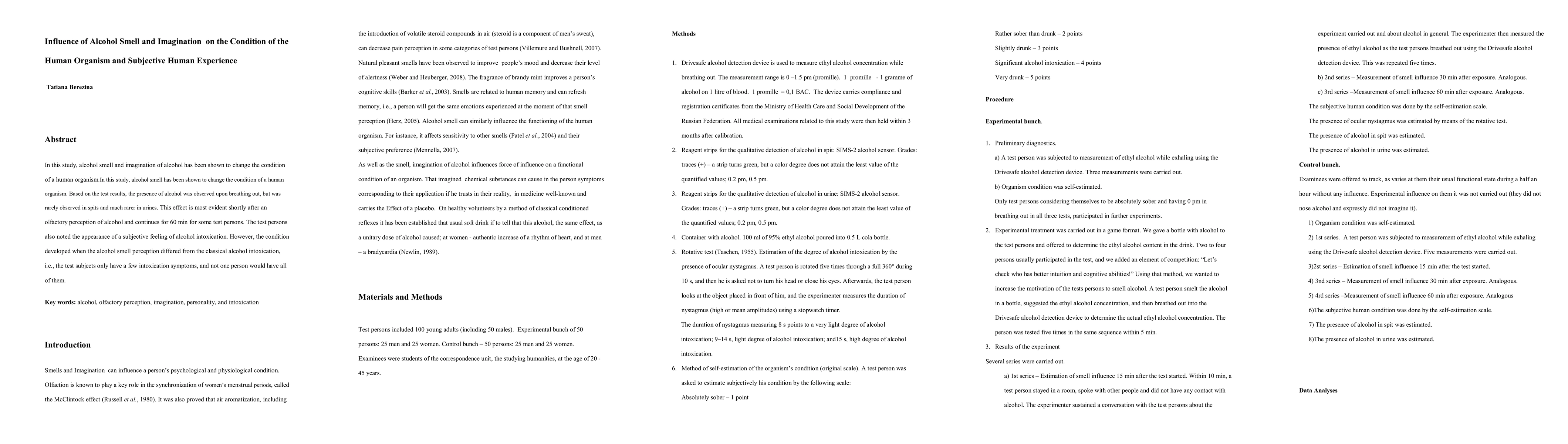 Alcohol smell affects human physiology and subjective experience, inducing symptoms like intoxication without actual intoxication, for up to 60 minutes after exposure.