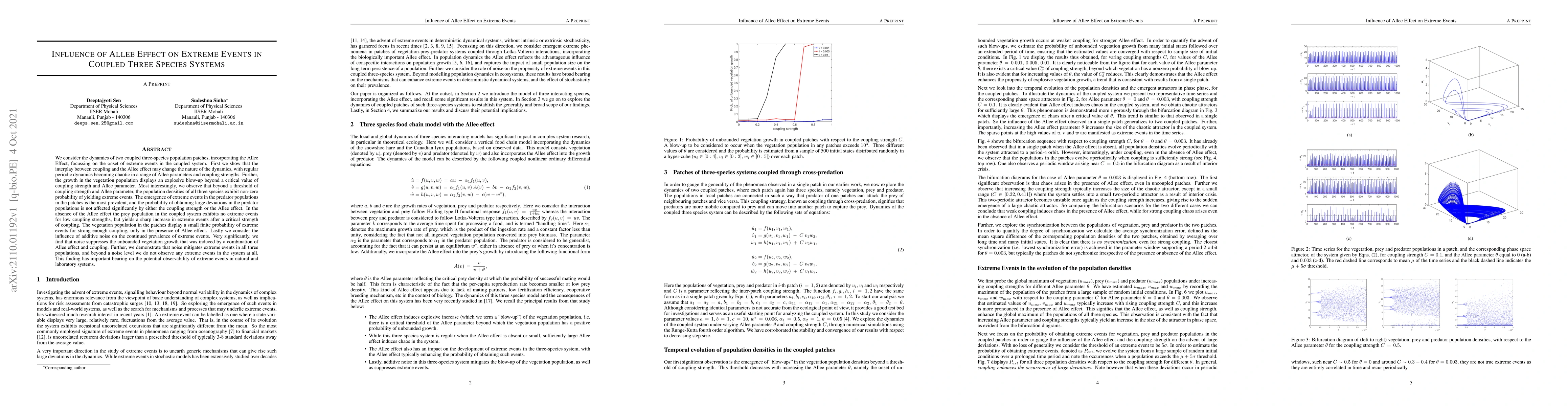 This paper investigates the dynamics of coupled three-species systems with the Allee effect, revealing that coupling and the Allee effect can lead to chaotic dynamics and extreme events. Noise is shown to suppress these extreme events and unbounded vegetation growth, indicating its potential role in mitigating extreme population fluctuations in natural systems.