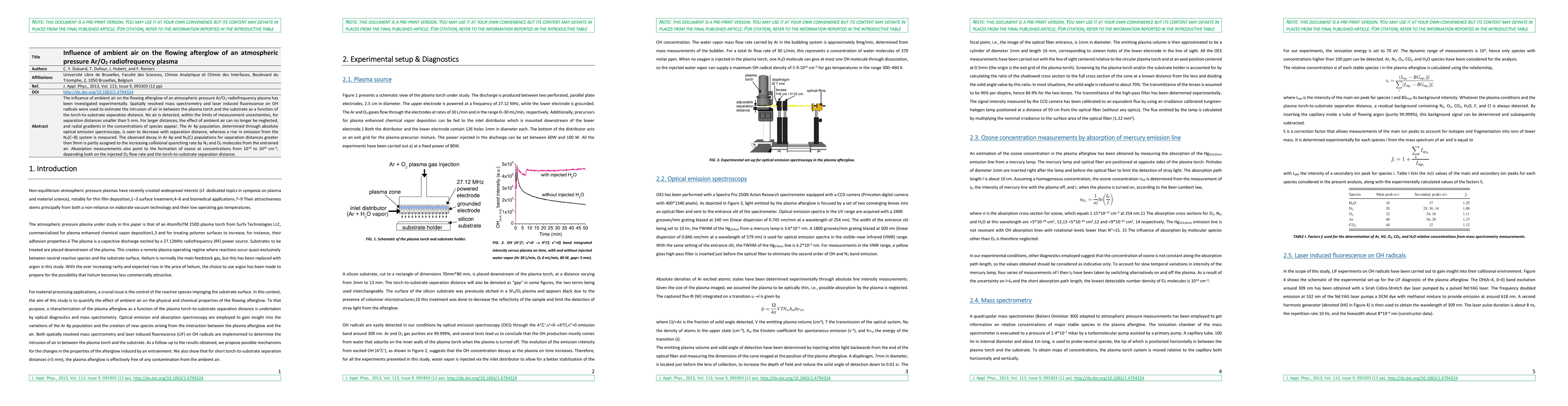 This study experimentally investigates the impact of ambient air on the flowing afterglow of an atmospheric pressure Ar/O2 radiofrequency plasma, finding negligible air intrusion for torch-to-substrate distances less than 5 mm. For larger distances, ambient air causes radial gradients in species concentrations and a decrease in Ar 4p population, alongside increased N2(C--B) emission and ozone formation.