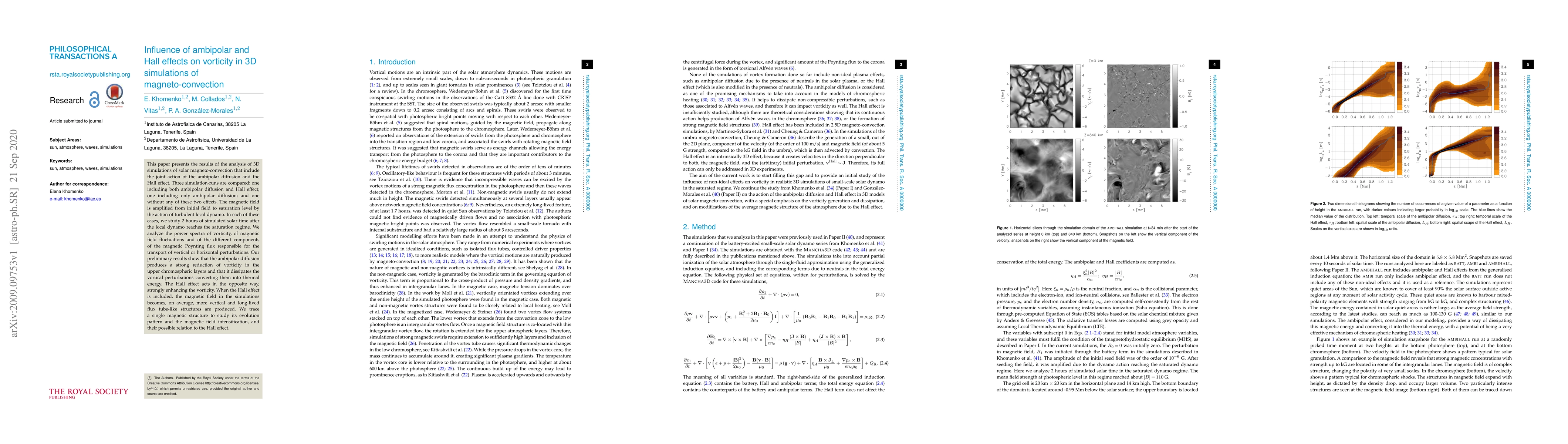This paper investigates the impact of ambipolar diffusion and the Hall effect on vorticity in 3D simulations of solar magneto-convection. Results show that ambipolar diffusion reduces vorticity while the Hall effect enhances it, leading to more vertical and long-lived magnetic flux structures.