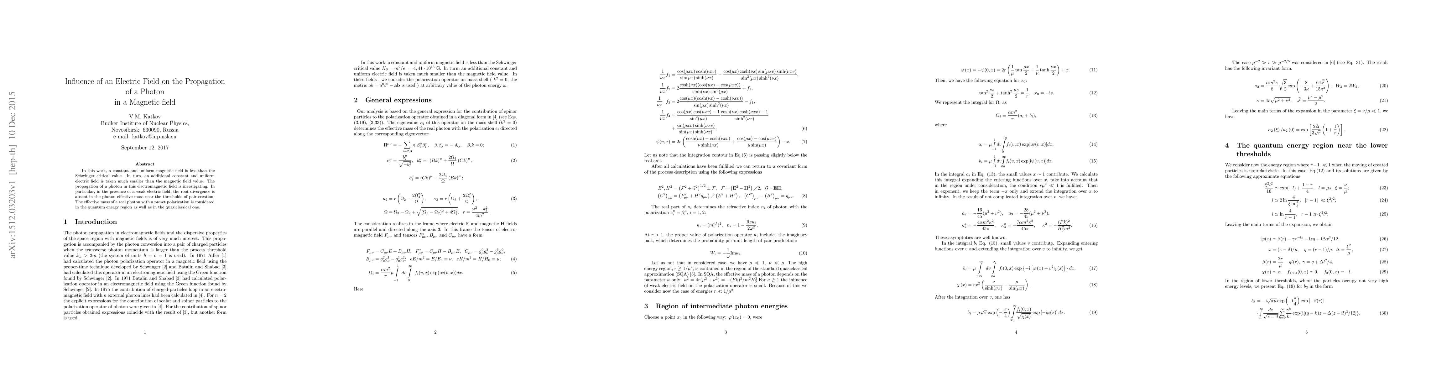 This research investigates the propagation of a photon in a combined constant magnetic and electric field, where the magnetic field is below the Schwinger critical value and the electric field is much smaller. It finds that a weak electric field prevents root divergence in the photon's effective mass near pair creation thresholds, considering both quantum and quasiclassical energy regions.