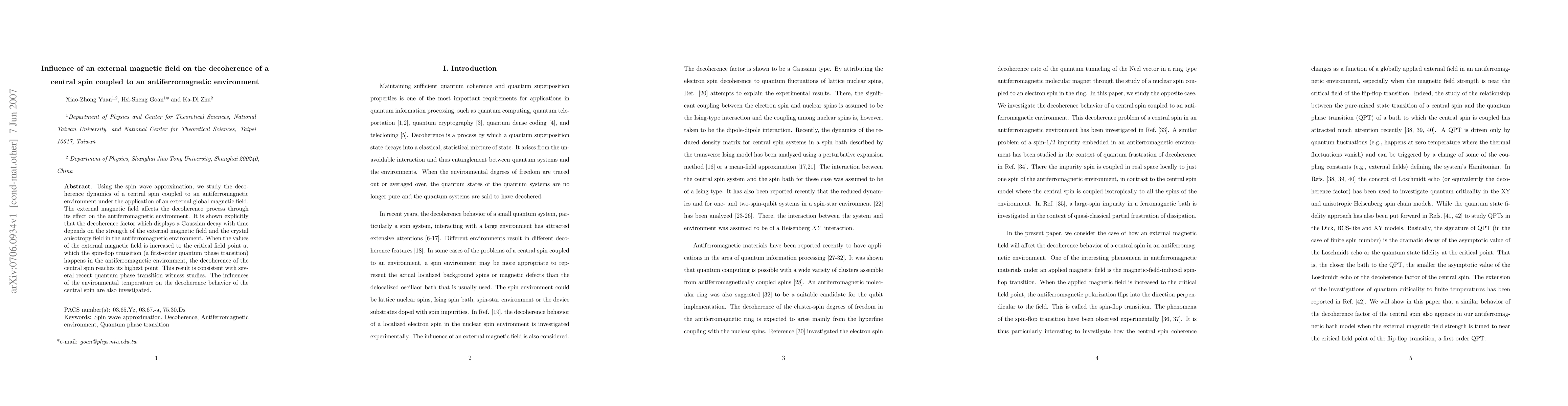 This study explores how an external magnetic field influences the decoherence of a central spin in an antiferromagnetic environment, revealing that the decoherence factor depends on both the external field strength and the crystal anisotropy field. The highest decoherence occurs at the spin-flop transition point, aligning with recent quantum phase transition research.