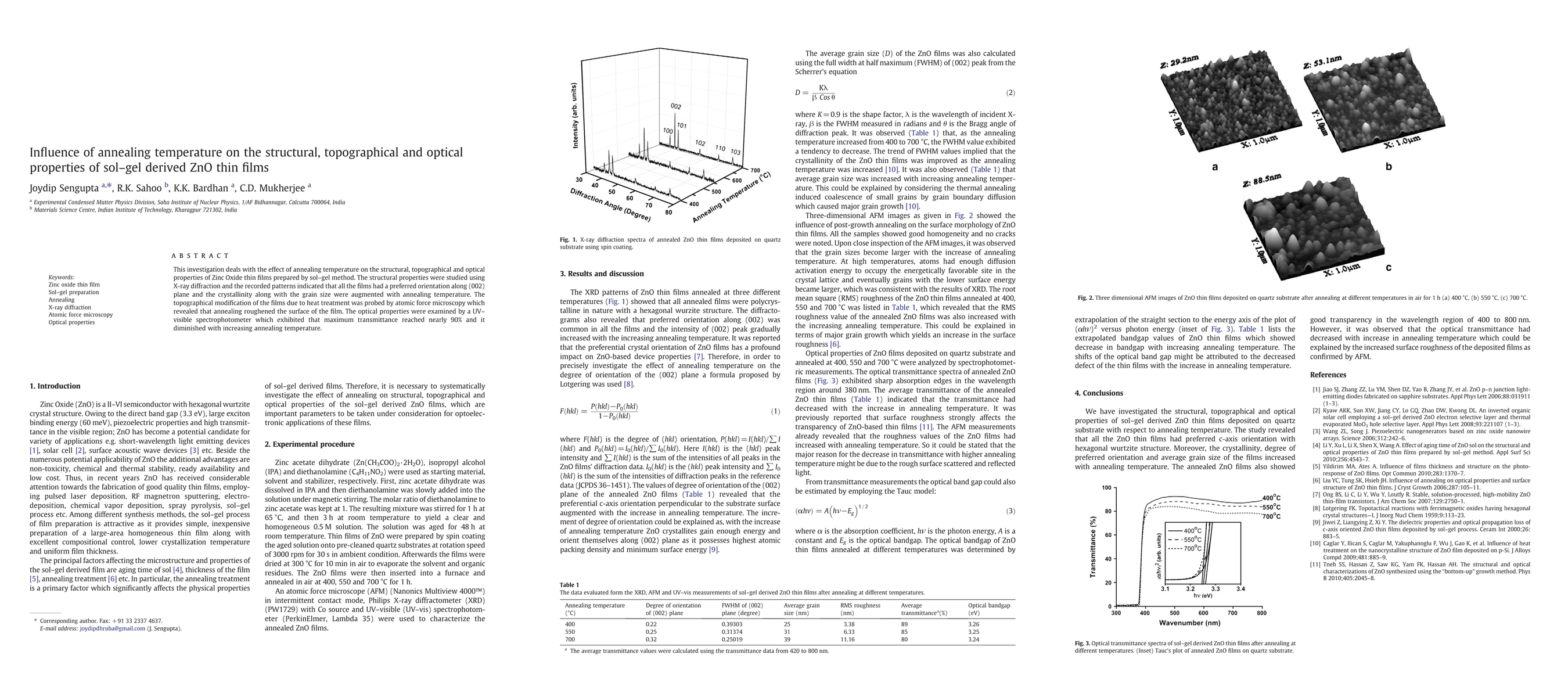 Summary: This study explores how annealing temperature impacts the structural, topographical, and optical properties of sol-gel derived ZnO thin films, revealing enhanced crystallinity and grain size with higher temperatures, surface roughening, and decreased optical transmittance with increased annealing temperature.