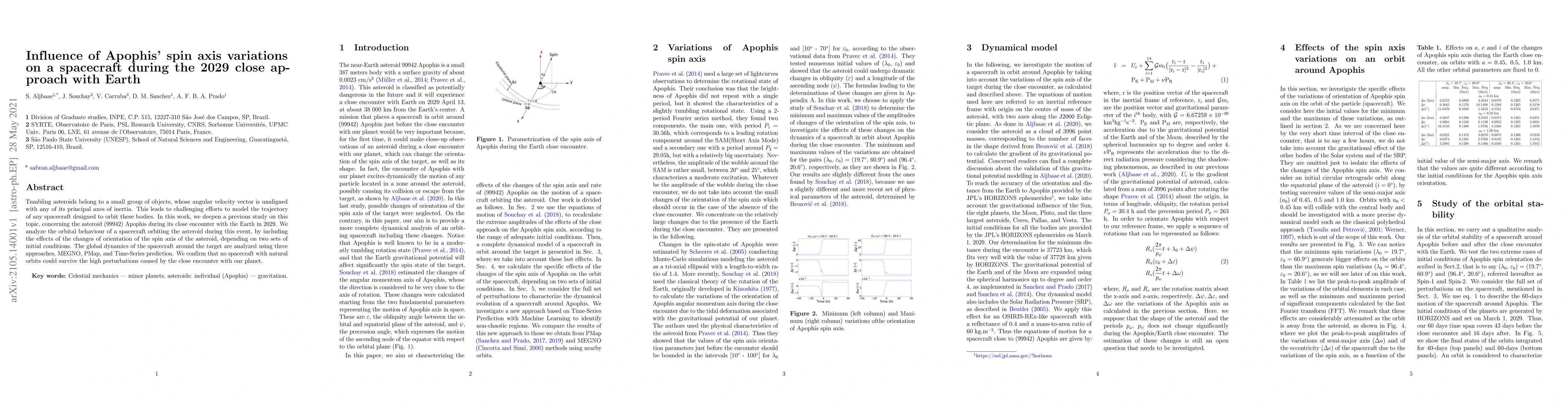 A study analyzed how changes in asteroid Apophis' spin axis affect spacecraft orbits during its 2029 close approach with Earth, concluding that no natural orbiting spacecraft could survive the high perturbations.