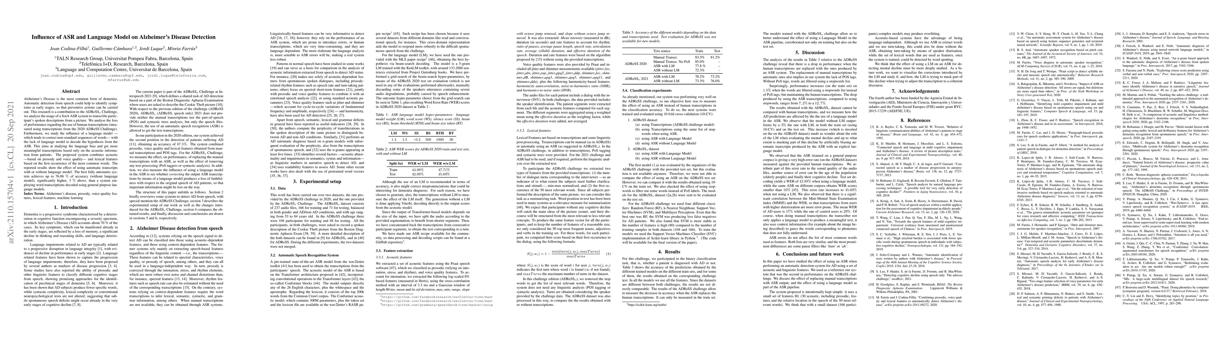 Alzheimer's Disease is the most common form of dementia. Automatic detection from speech could help to identify symptoms at early stages, so that preventive actions can be carried out. This research is a contribution to the ADReSSo Challenge, we analyze the usage of a SotA ASR system to transcribe participant's spoken descriptions from a picture. We analyse the loss of performance regarding the use of human transcriptions (measured using transcriptions from the 2020 ADReSS Challenge). Furthermore, we study the influence of a language model -- which tends to correct non-standard sequences of words -- with the lack of language model to decode the hypothesis from the ASR. This aims at studying the language bias and get more meaningful transcriptions based only on the acoustic information from patients. The proposed system combines acoustic -- based on prosody and voice quality -- and lexical features based on the first occurrence of the most common words. The reported results show the effect of using automatic transcripts with or without language model. The best fully automatic system achieves up to 76.06 % of accuracy (without language model), significantly higher, 3 % above, than a system employing word transcriptions decoded using general purpose language models.