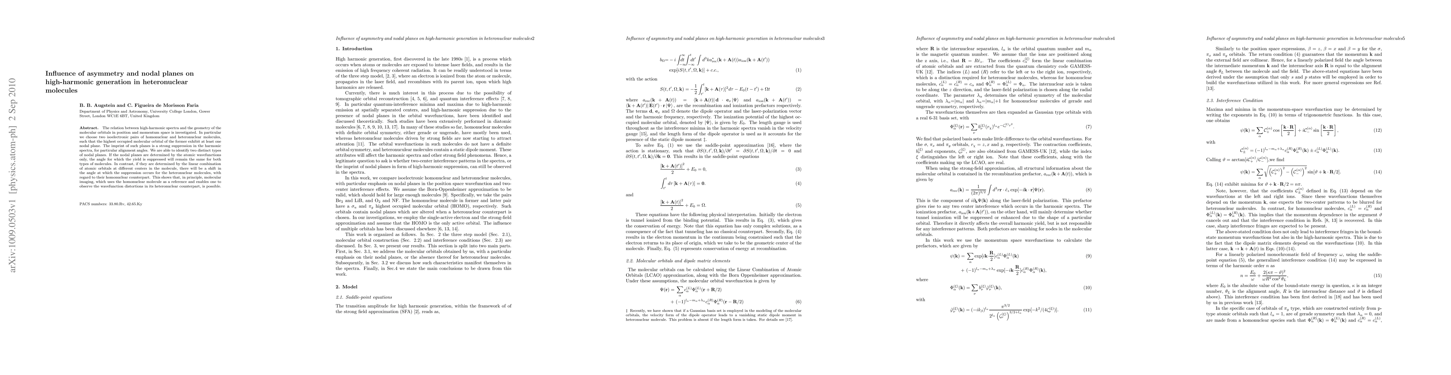 This study investigates how molecular geometry, particularly asymmetry and nodal planes in molecular orbitals, affects high-harmonic generation. It finds that heteronuclear molecules exhibit shifts in harmonic suppression angles compared to homonuclear counterparts, revealing potential for molecular imaging using high-harmonic spectra.