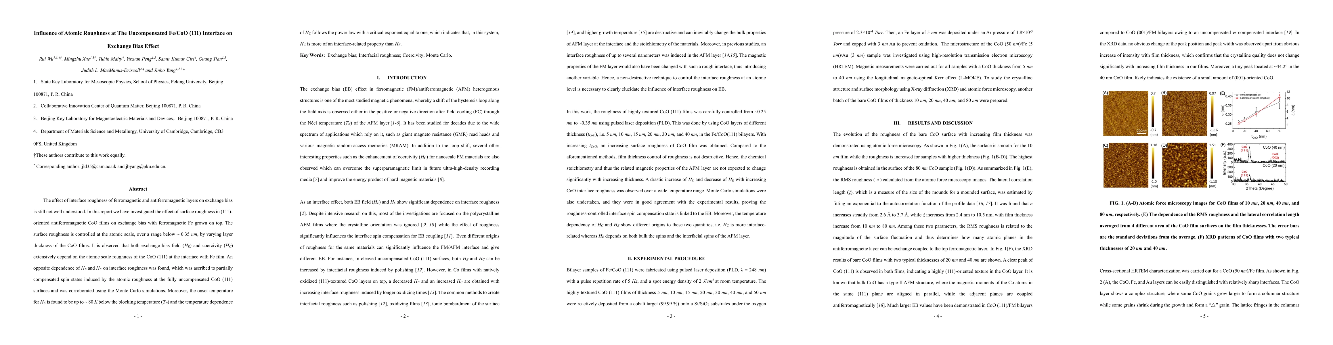 This paper investigates the effect of atomic roughness at the Fe/CoO (111) interface on exchange bias, finding that roughness influences both the exchange bias field and coercivity in opposite ways due to induced spin states. The study reveals that coercivity is more interface-related than exchange bias, with its onset temperature significantly lower than the blocking temperature.