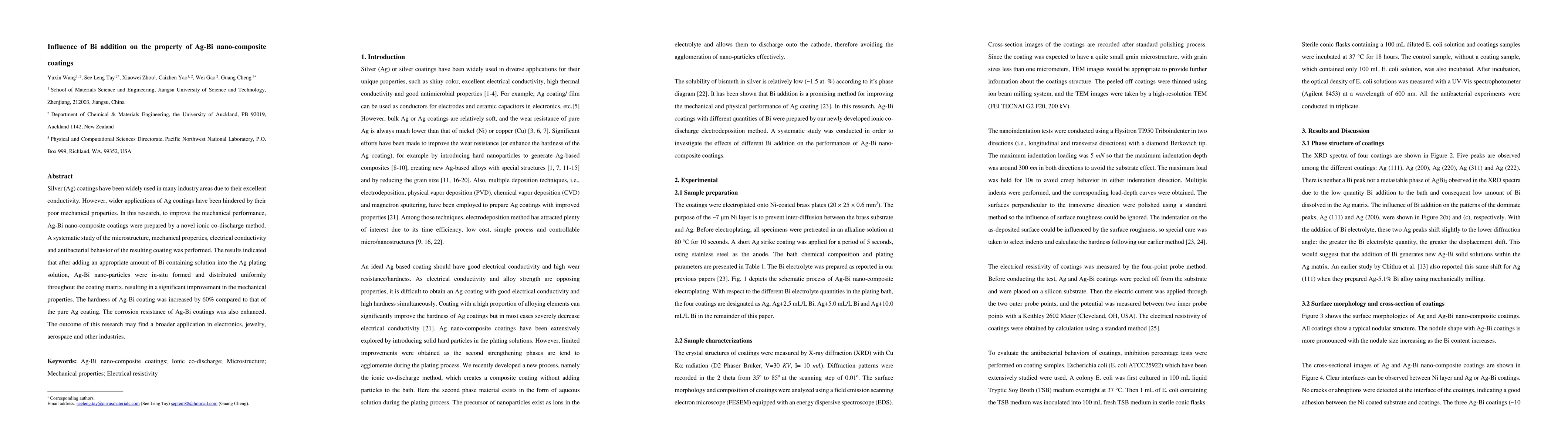 This study investigates the enhancement of mechanical properties in Ag coatings by incorporating Bi via a novel ionic co-discharge method, resulting in uniformly distributed Ag-Bi nano-composite coatings. The findings show a 60% increase in hardness and improved corrosion resistance, suggesting potential applications across electronics, aerospace, and jewelry industries.