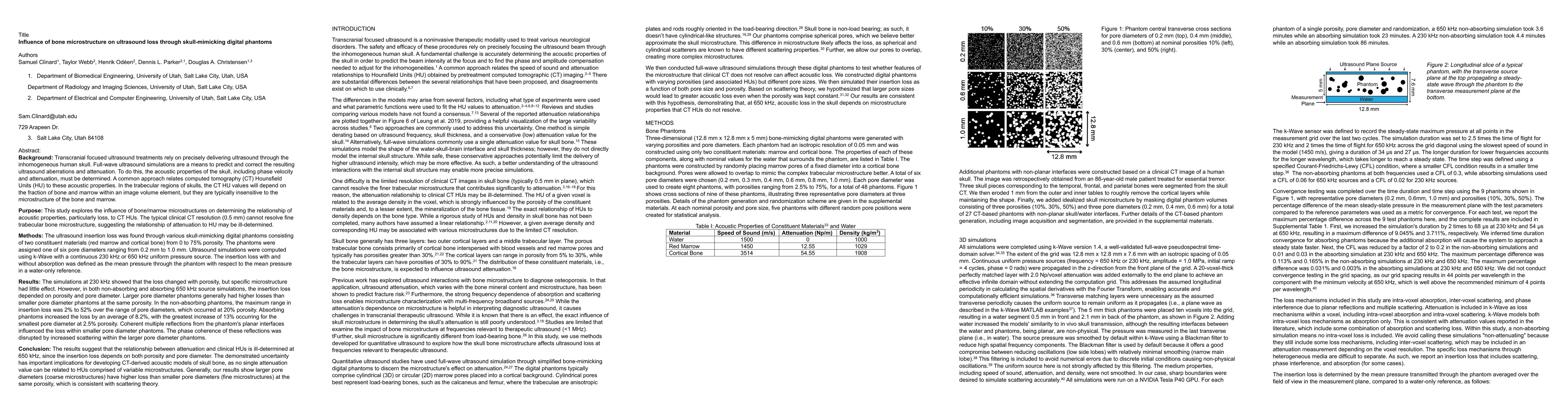 Transcranial focused ultrasound applications often use simulations that require accurate acoustic properties, which can be related to computed tomography (CT) Hounsfield Units (HU). However, clinical CT is insensitive to microstructure. This study examines how bone/marrow microstructure introduces variations in acoustic property relationships to CT HUs. The insertion loss was found through skull-mimicking digital phantoms with two materials (bone/marrow) from 0 to 75% porosity. The phantoms had one of six pore diameters ranging from 0.2 mm to 1.0 mm. k-Wave simulations were computed with a continuous 230 kHz or 650 kHz uniform pressure source. The insertion loss was defined as the transmitted mean pressure relative to a water-only reference. The 230 kHz loss changed with porosity, but microstructure had little effect. However, the 650 kHz loss in both non-absorbing and absorbing simulations depended on porosity and pore diameter. Larger pore phantoms generally had higher losses than smaller pore diameter phantoms at the same porosity. In the non-absorbing phantoms, the maximum range in insertion loss was 2% to 52%, which occurred at 20% porosity. Absorption increased the loss by 8.2% on average, with the greatest increase of 13% in the smallest pore (0.2 mm) and 2.5% porosity phantom. Coherent multiple reflections from the phantom's planar interfaces influenced the loss from smaller pores, while larger pores disrupt this phase coherence. The insertion loss dependence on porosity and pore diameter shows that the attenuation-HU relationship is ill-determined at 650 kHz. This uncertainty has implications for CT-derived acoustic models, as no single attenuation corresponds to HUs with variable microstructures.