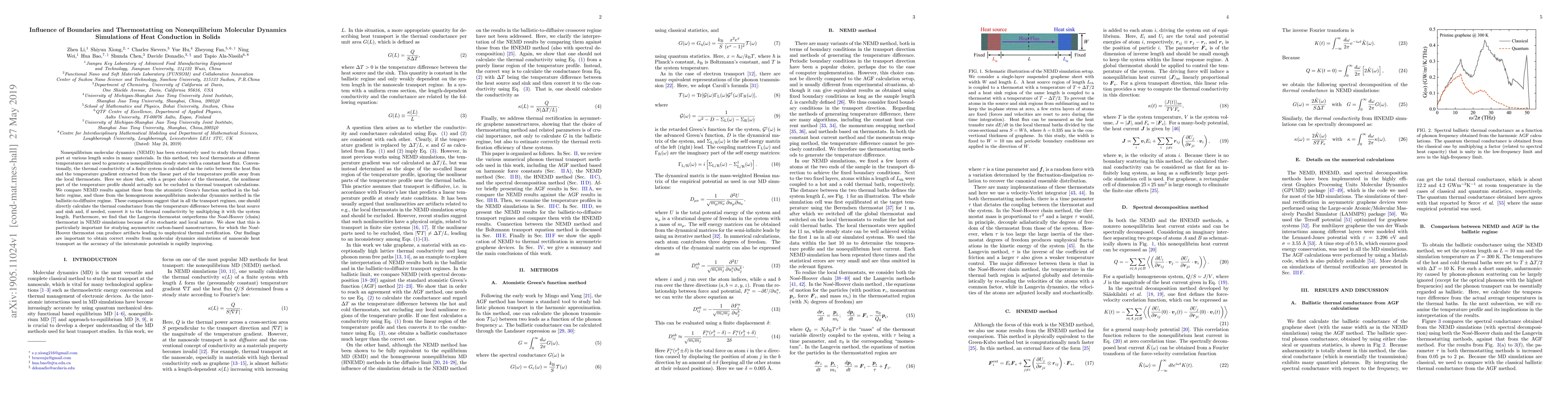 This paper investigates the influence of thermostat choice and boundary conditions on nonequilibrium molecular dynamics (NEMD) simulations of heat conduction in solids. It finds that the nonlinear part of the temperature profile should be included in thermal transport calculations and that the Langevin thermostat is more effective than the Nosé-Hoover thermostat, especially for asymmetric carbon-based nanostructures, due to its stochastic and local nature.