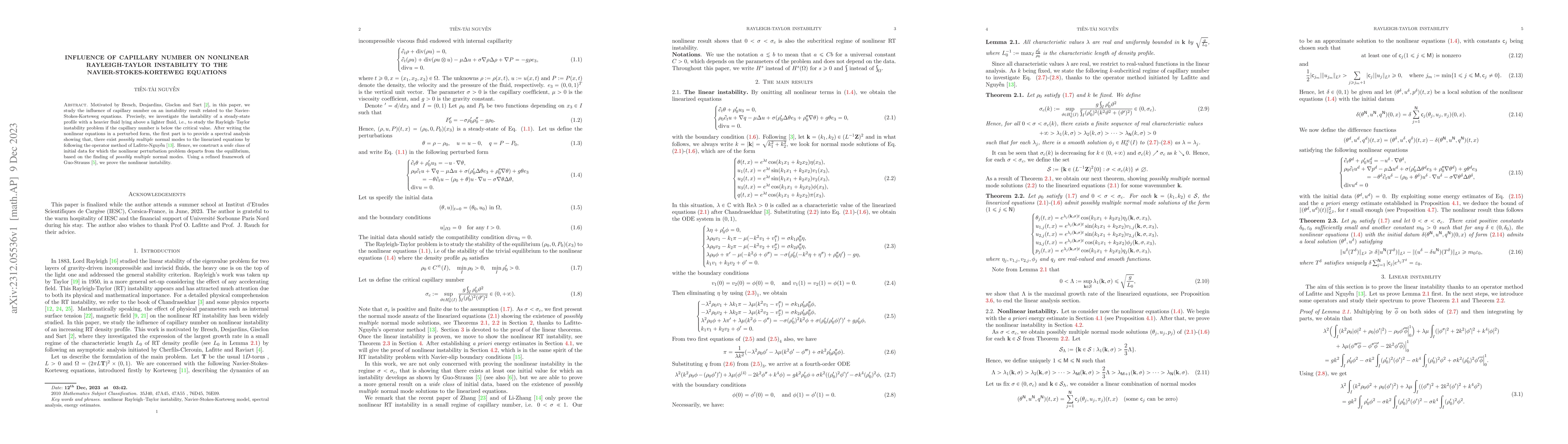 This paper investigates the Rayleigh-Taylor instability under the Navier-Stokes-Korteweg equations, examining the influence of capillary number below the critical value. It employs spectral analysis and operator methods to demonstrate the existence of multiple normal modes, leading to the proof of nonlinear instability using a refined framework.