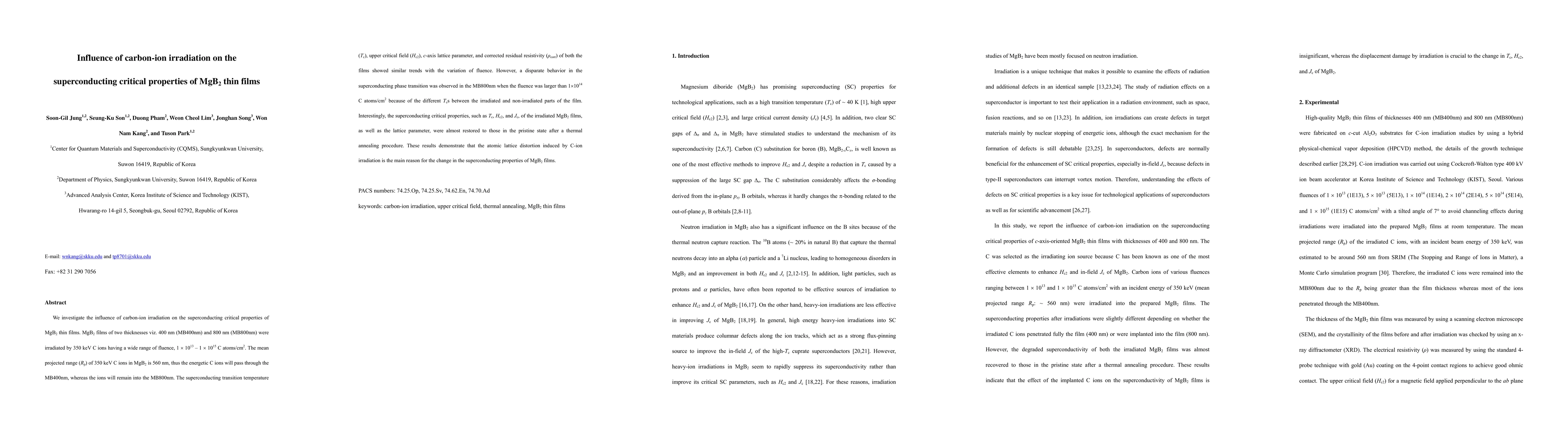 This study investigates the impact of carbon-ion irradiation on the superconducting properties of MgB$_2$ thin films, finding that irradiation alters $T_c$, $H_{c2}$, and $J_c$ due to lattice distortion. Thermal annealing restores these properties, indicating the primary role of lattice distortion in the observed changes.