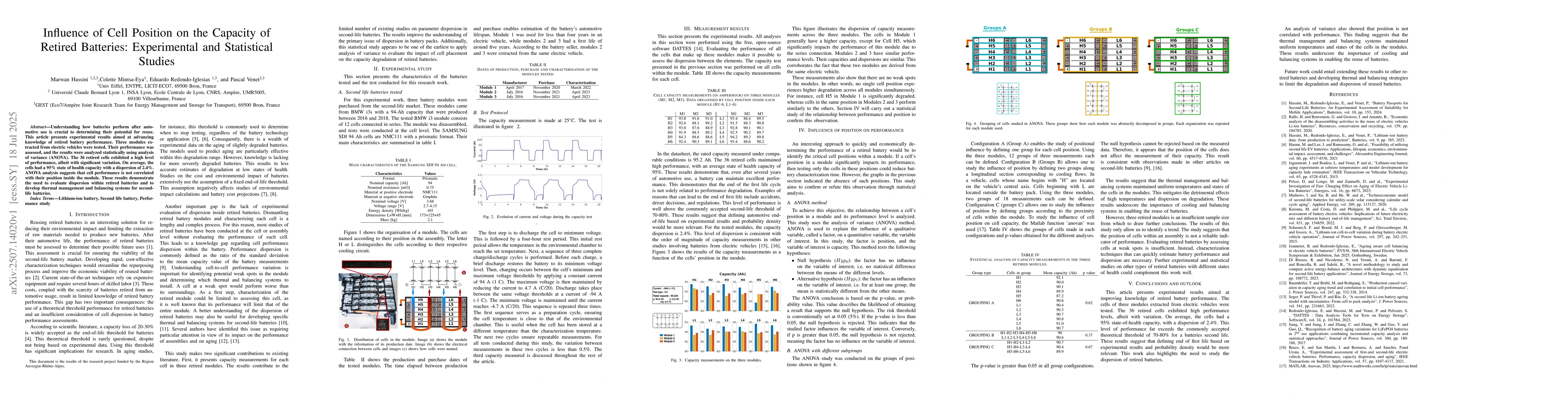 Understanding how batteries perform after automotive use is crucial to determining their potential for reuse. This article presents experimental results aimed at advancing knowledge of retired battery performance. Three modules extracted from electric vehicles were tested. Their performance was assessed, and the results were analyzed statistically using analysis of variance (ANOVA). The 36 retired cells exhibited a high level of performance, albeit with significant variation. On average, the cells had a 95% state of health capacity with a dispersion of 2.4%. ANOVA analysis suggests that cell performance is not correlated with their position inside the module. These results demonstrate the need to evaluate dispersion within retired batteries and to develop thermal management and balancing systems for second-life batteries.