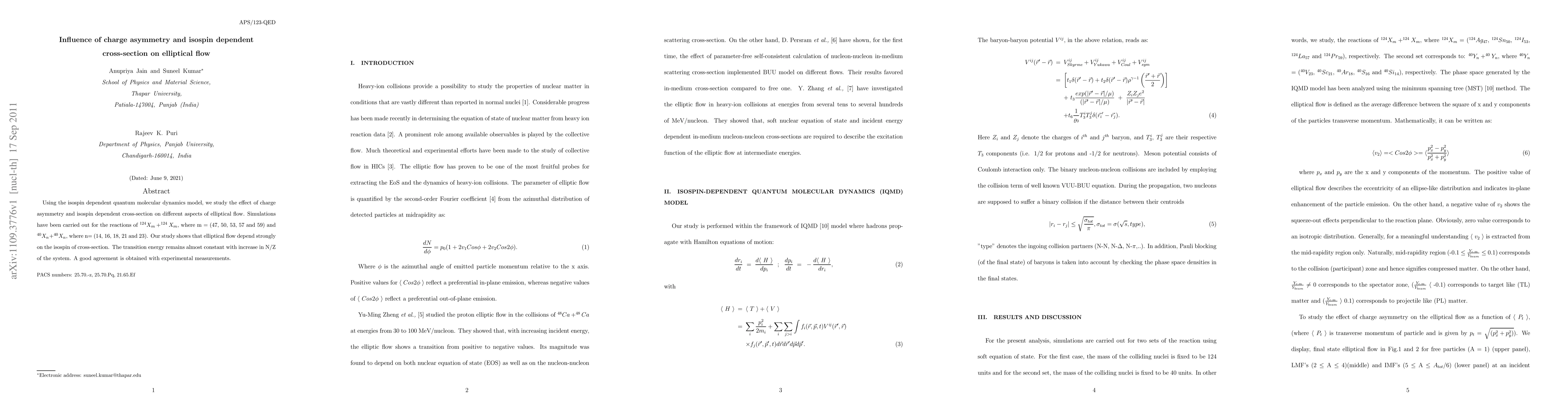 This paper investigates the impact of charge asymmetry and isospin-dependent cross-sections on elliptical flow using the isospin-dependent quantum molecular dynamics model. The study finds that elliptical flow is strongly influenced by the isospin of the cross-section, with the transition energy remaining nearly constant with increasing N/Z ratio, and results align well with experimental data.
