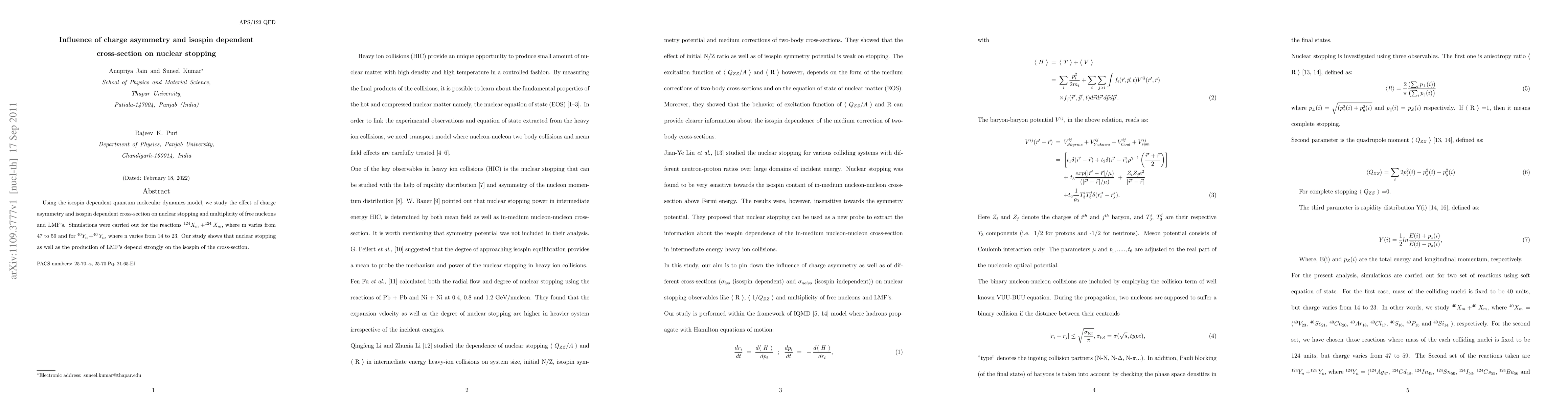 This research is important as it provides insights into the role of charge asymmetry and isospin dependent cross-sections in nuclear stopping, which can enhance our understanding of heavy-ion collisions and their applications in astrophysics.